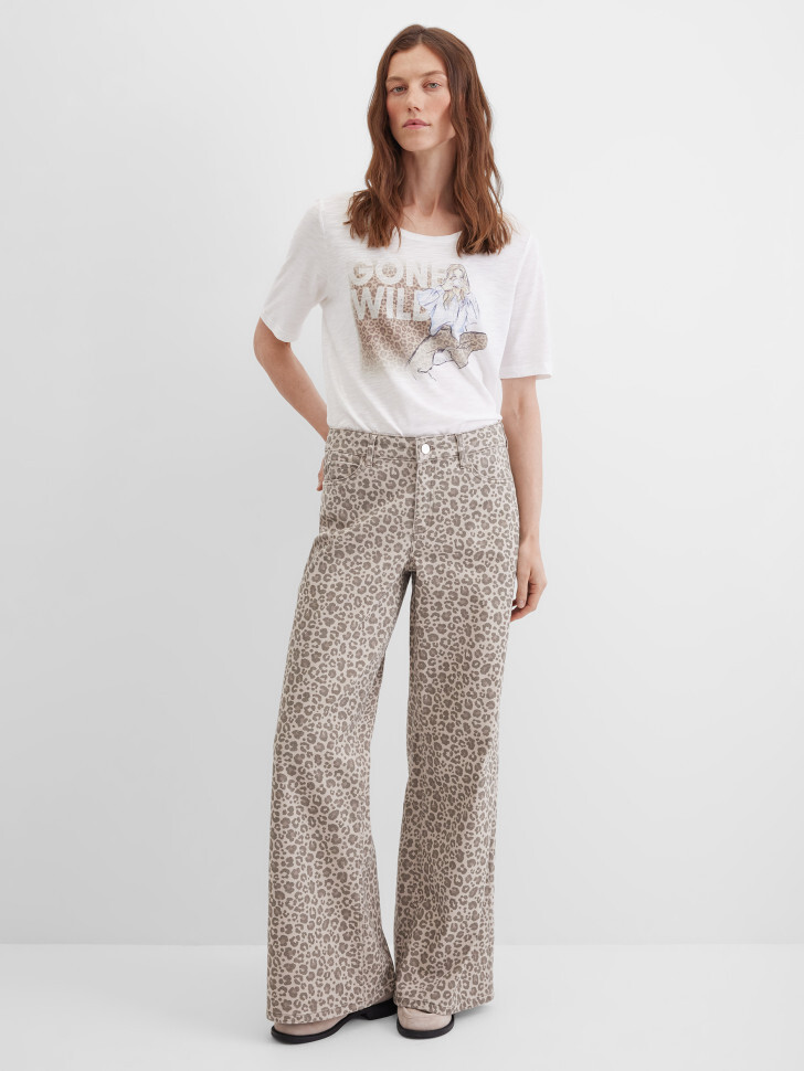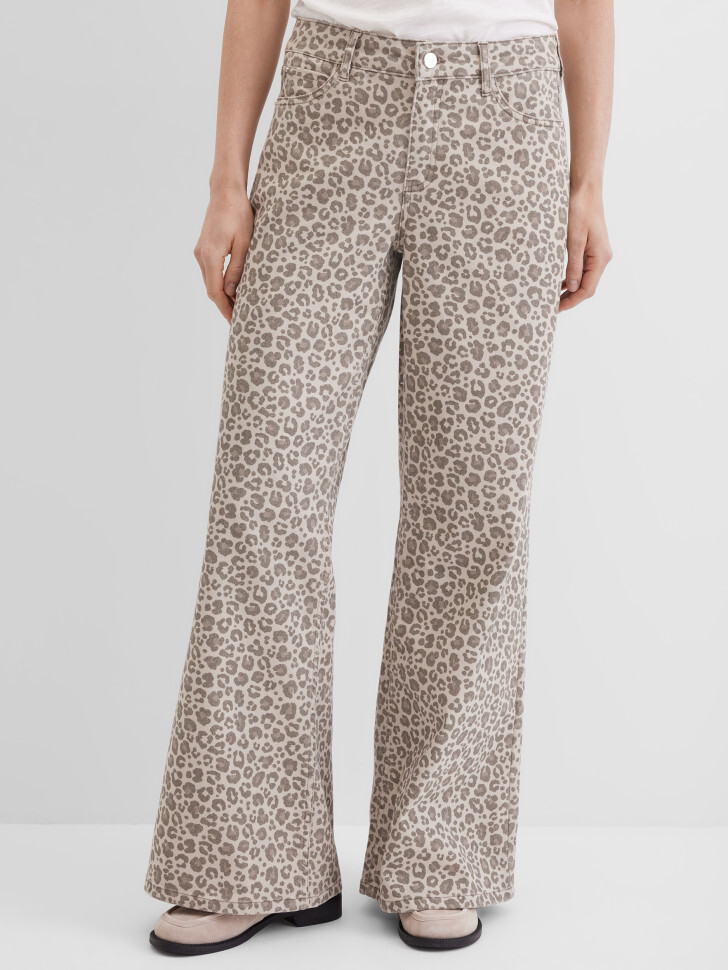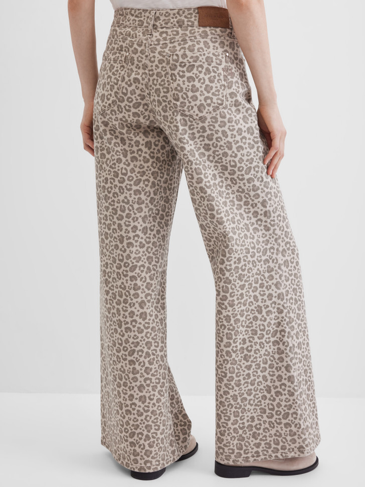 Джинсы прямого широкого кроя из эластичного денима в актуальном леопардовом принте — дерзкая и модная альтернатива классическим моделям. Средняя посадка комфортна в носке, а полный рост визуально удлиняет ноги. Застежка на молнии и пуговице обеспечивает надежную фиксацию. Модель выполнена в классическом стиле 5 карманов: отрезные спереди и накладные сзади, дополненные кокеткой и шлевками для ремня. Леопардовый узор придает индивидуальность, превращая джинсы в яркий акцент образа.