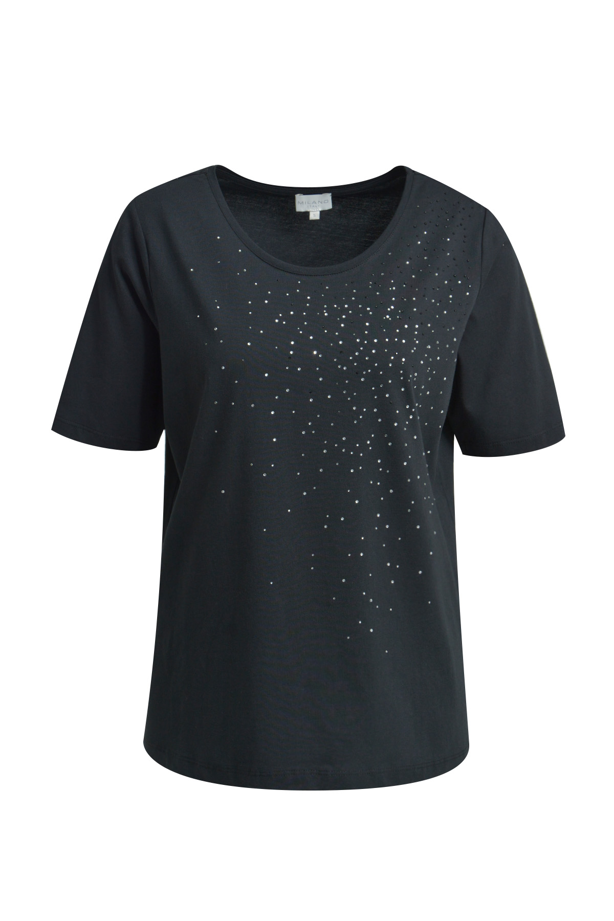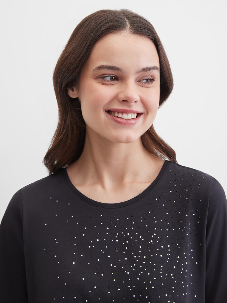 Универсальная футболка прямого свободного кроя из стопроцентного хлопка — удобная и практичная основа гардероба. Круглый вырез и короткие рукава обеспечивают классический вид. Изюминка модели — аккуратный декор из мелких страз, который придает изделию утончённый блеск и элегантность, сохраняя при этом минималистичный стиль.
