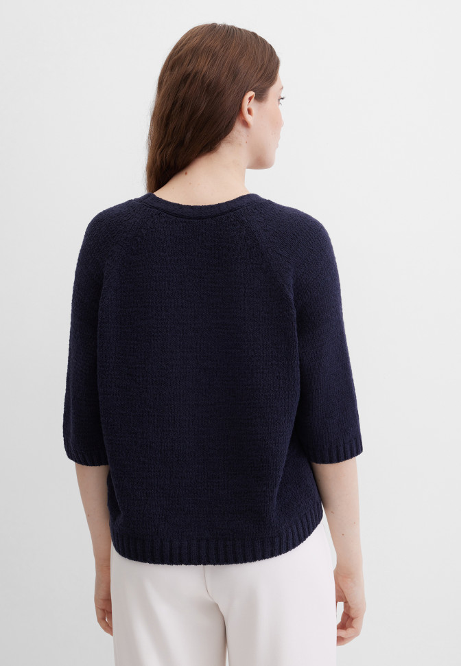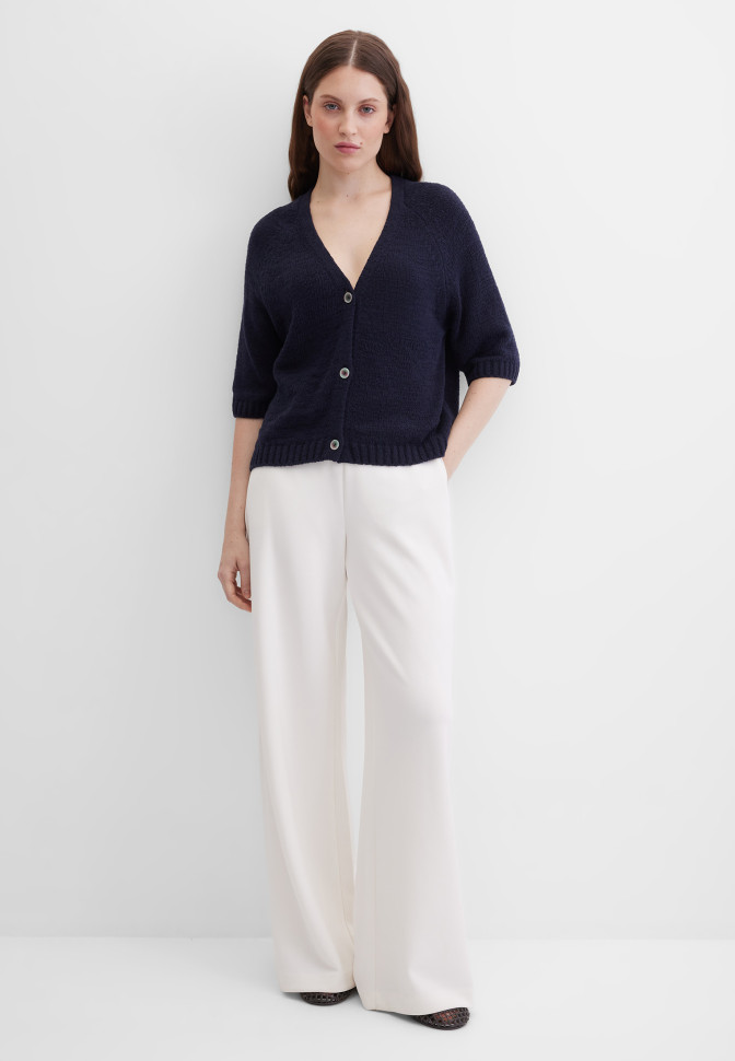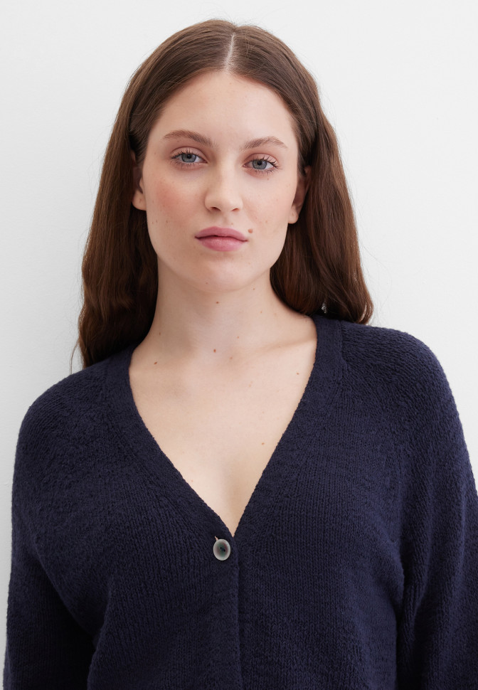 Длина по спинке – 52 см. Кардиган прямого укороченного кроя из мягкой смесовой пряжи с высоким содержанием хлопка, которая обеспечивает комфорт, естественную воздухопроницаемость и приятную тактильность. Благодаря аккуратной плотной вязке изделие хорошо держит форму и выглядит структурно. Укороченный рукав реглан создаёт мягкий силуэт и не стесняет движений, а глубокий v-образный вырез подчёркивает лаконичность и визуально вытягивает силуэт. Планка пуговиц с легким перламутровым эффектом добавляет изделию элемент классического стиля. Эластичная вязка в резинку по краям сохраняет аккуратную, законченную форму. Благодаря универсальному крою и лаконичности дизайна этот кардиган прекрасно подходит для создания как расслабленных образов, так и деловых, офисных комплектов.