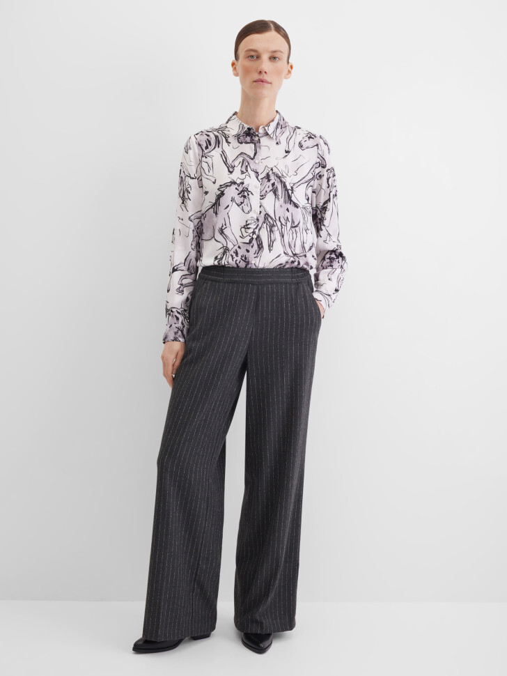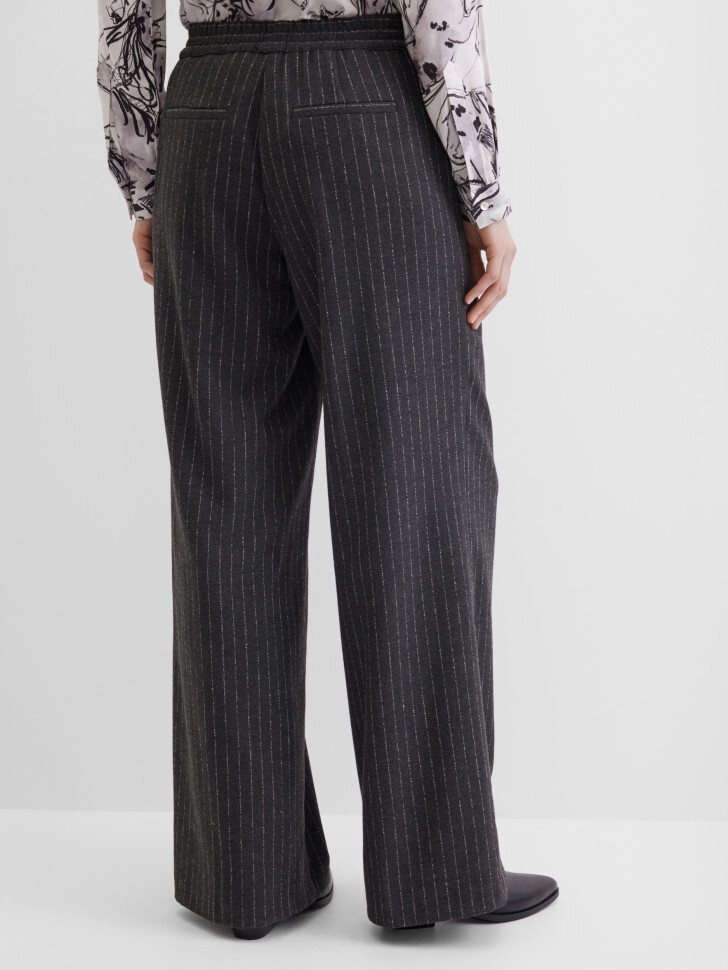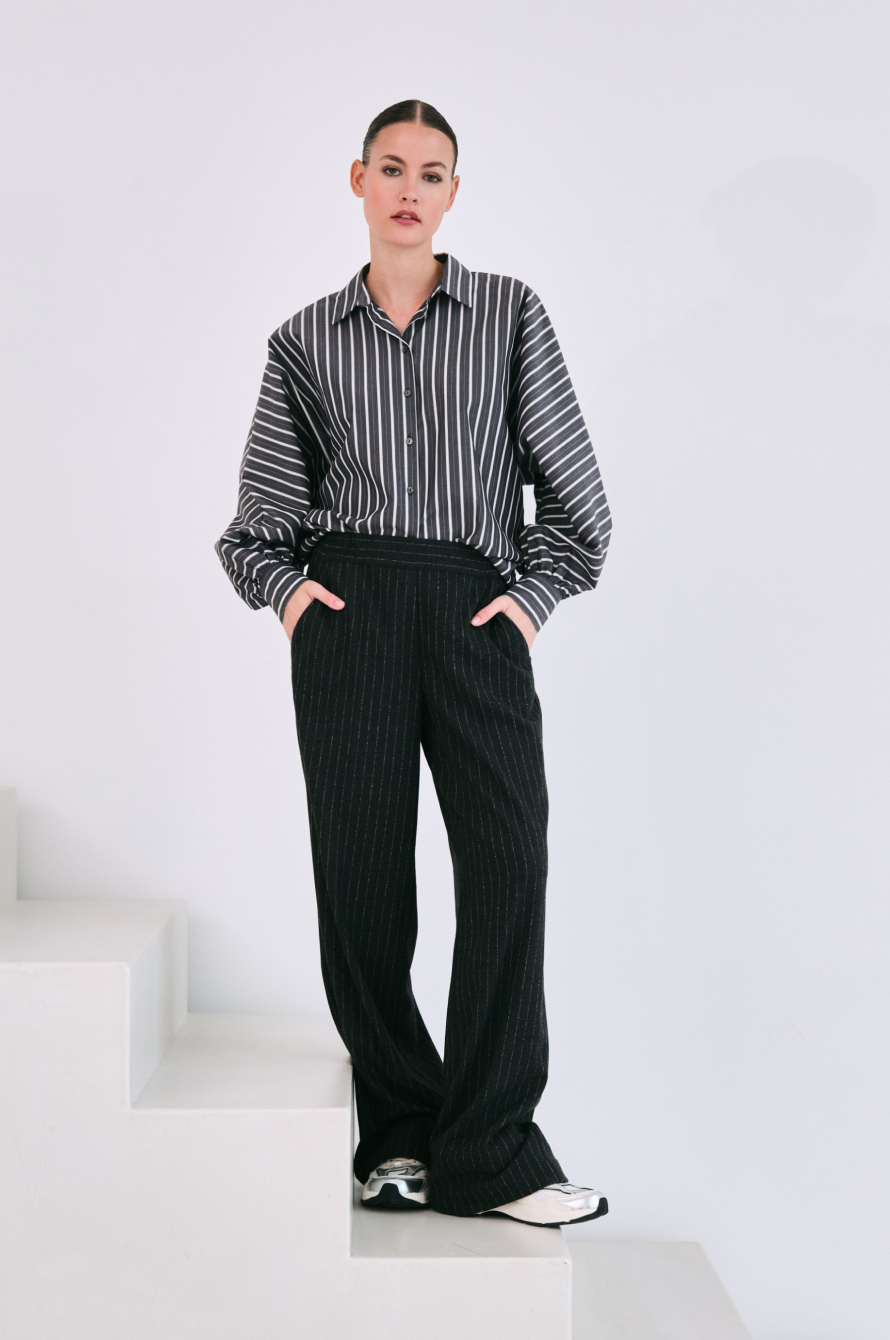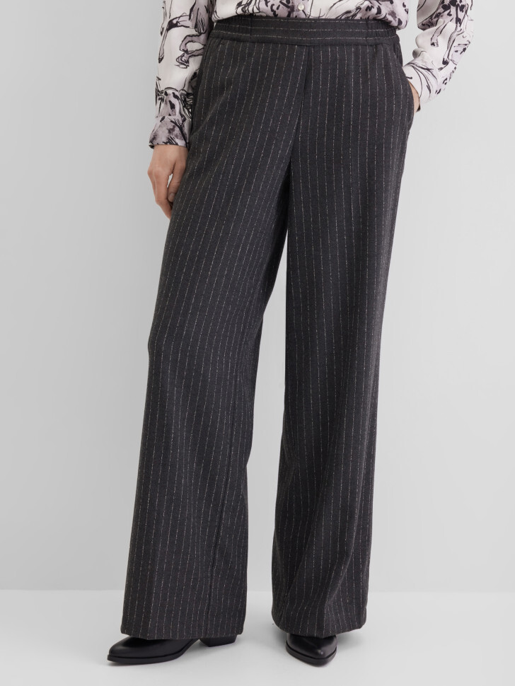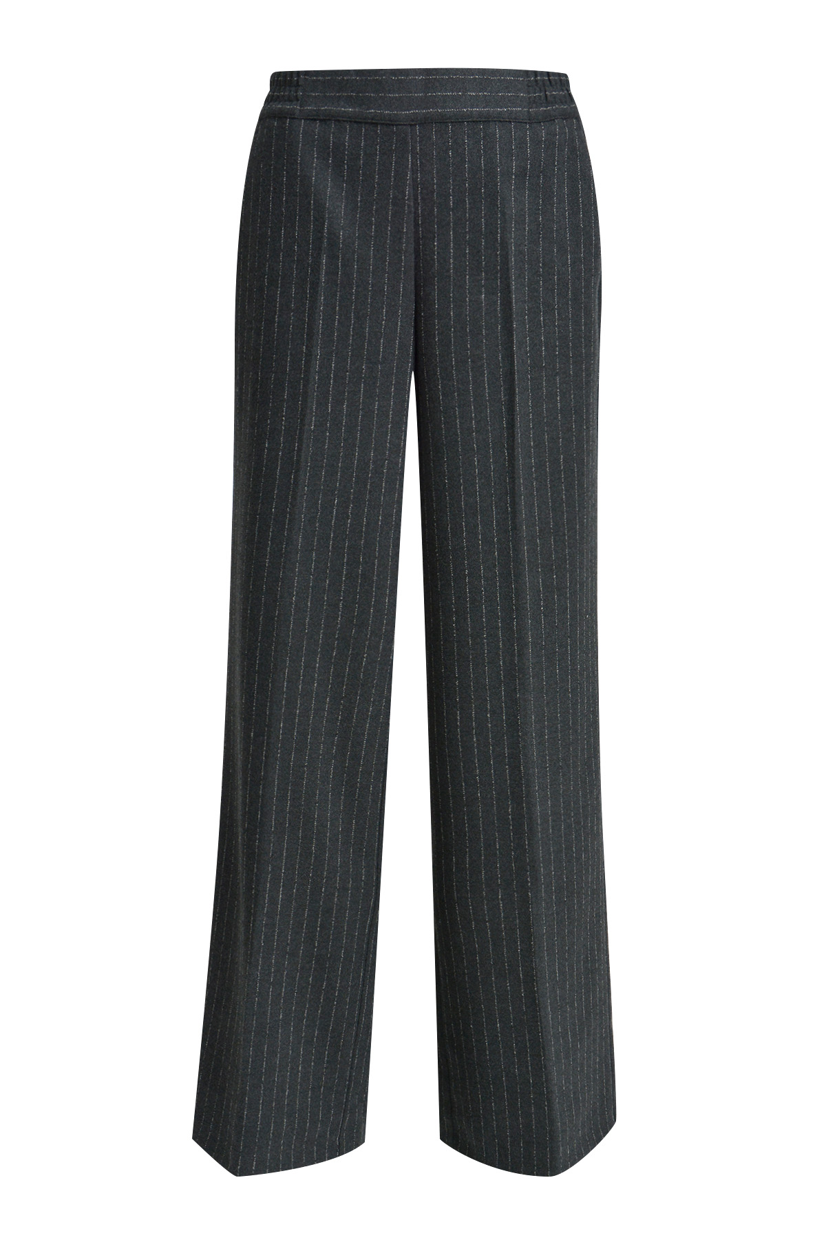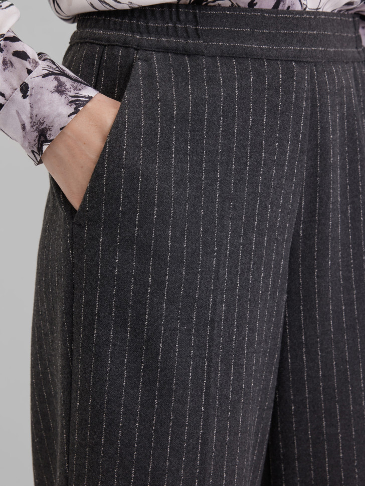 Классические брюки-палаццо из плотной смесовой вискозы в полоску — элегантный вариант для стильного офиса или повседневных образов. Свободный прямой крой и средняя посадка визуально удлиняют силуэт, а мягкая ткань комфортно садится по фигуре. Эластичная резинка на талии обеспечивает удобство и универсальную посадку. Отрезные карманы сбоку добавляют функциональности, а ложные сзади сохраняют строгий силуэт. Заутюженные стрелки делают модель более структурной и изящной.