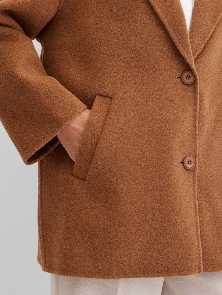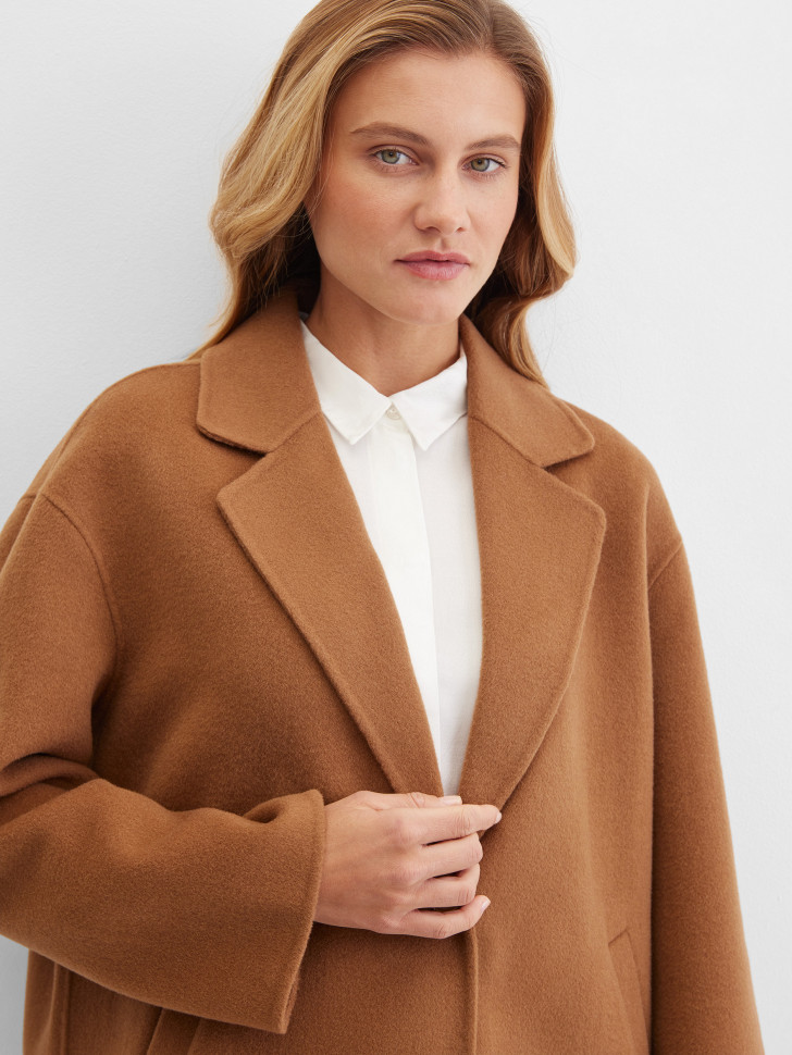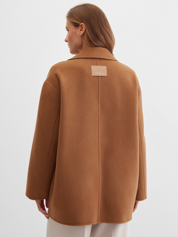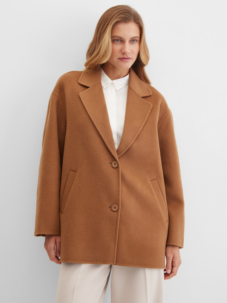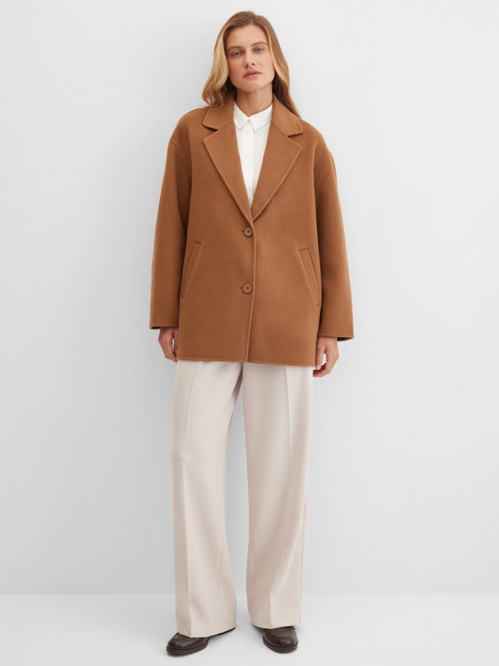 Длина по спинке – 74 см. Элегантное пальто прямого укороченного кроя из из плотного шерстяного материала с характерной фактурой варёной шерсти (boiled wool) — стильный вариант для прохладного сезона. Ткань обладает мягкой ворсистой поверхностью, натуральная шерсть прекрасно сохраняет тепло, при этом остаётся дышащей и комфортной в носке. Брендированная нашивка на спинке добавляет фирменный акцент. Английский воротник формирует классический силуэт, а прорезные карманы делают модель функциональной. Полупальто без подкладки с закрытыми рельефными швами, характерными для изделий из двуслойной шерсти double face — мягко облегает фигуру, создавая расслабленный силуэт. Идеально для демисезонного гардероба.
