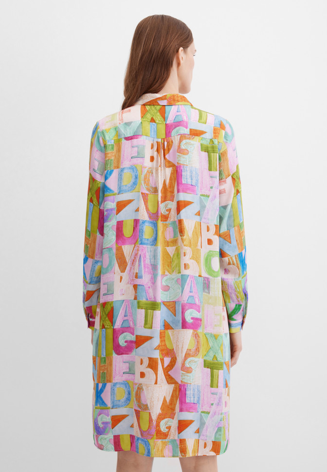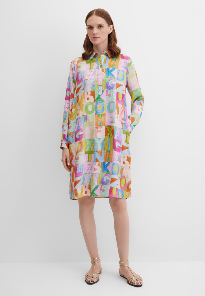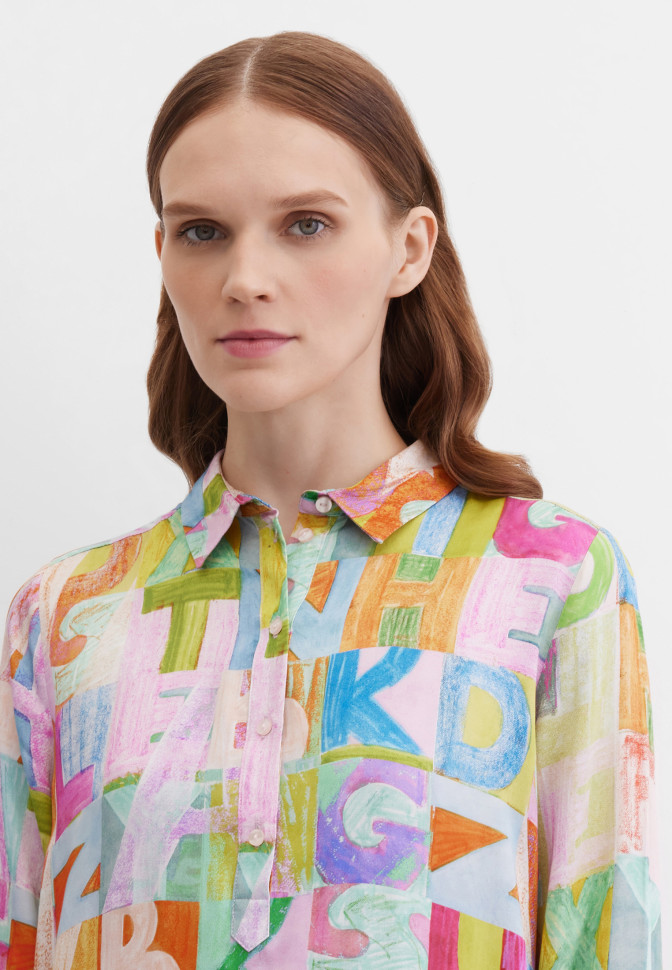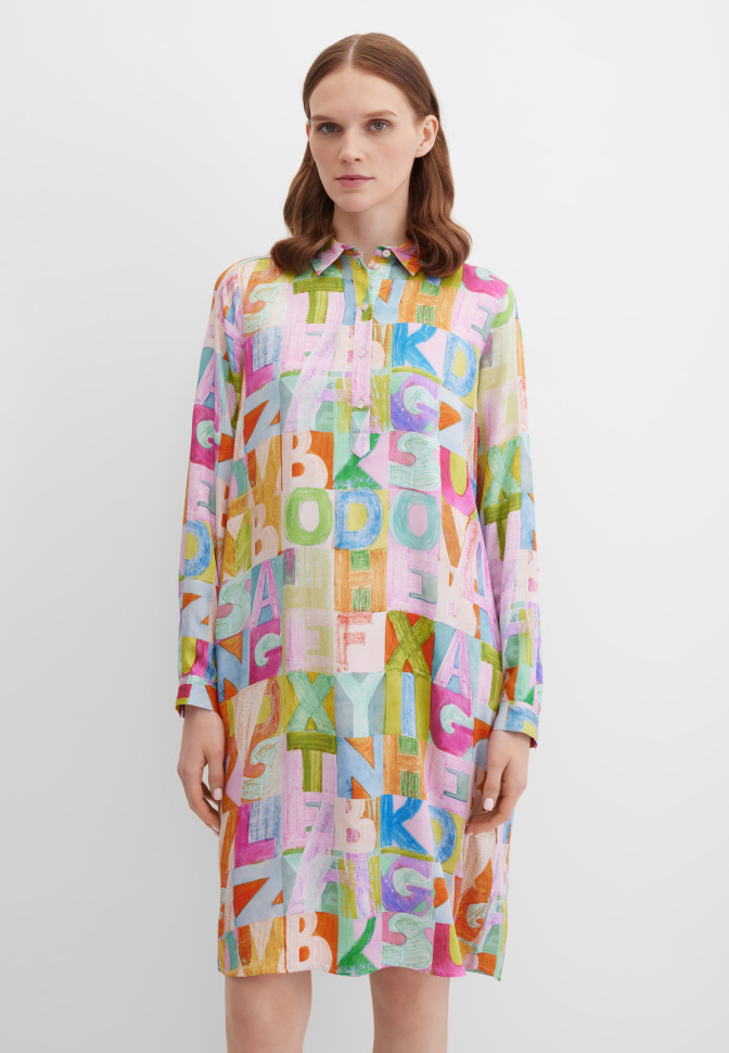 Длина по спинке – 99 см. Платье-рубашка миди прямого кроя из струящейся вискозы с выразительным абстрактным принтом в виде букв. Гладкая, приятная ткань красиво драпируется при движении, подчеркивая женственность. Модель на пуговицах до середины изделия, с отложным воротником, длинными рукавами с манжетами на пуговицах и мягкими сборками по кокетке на спинке — для воздушного и расслабленного силуэта. Карманы в швах добавляют функциональности, не утяжеляя силуэт, а рисунок придаёт изделию динамику и характер.