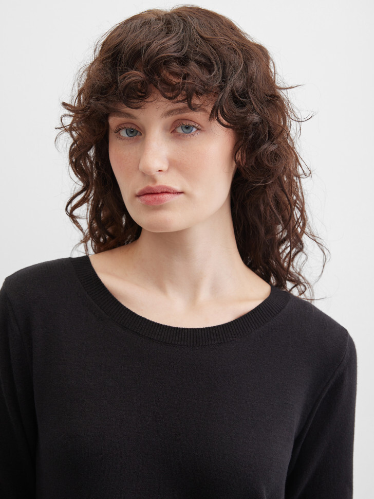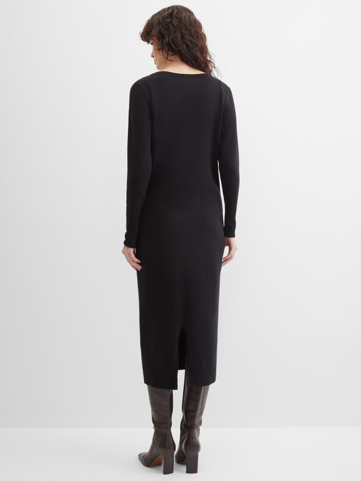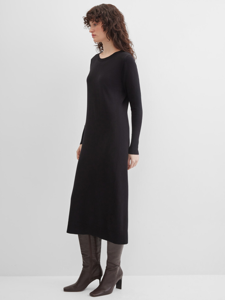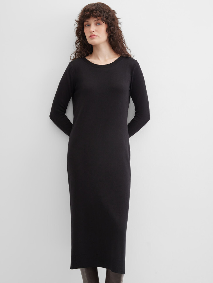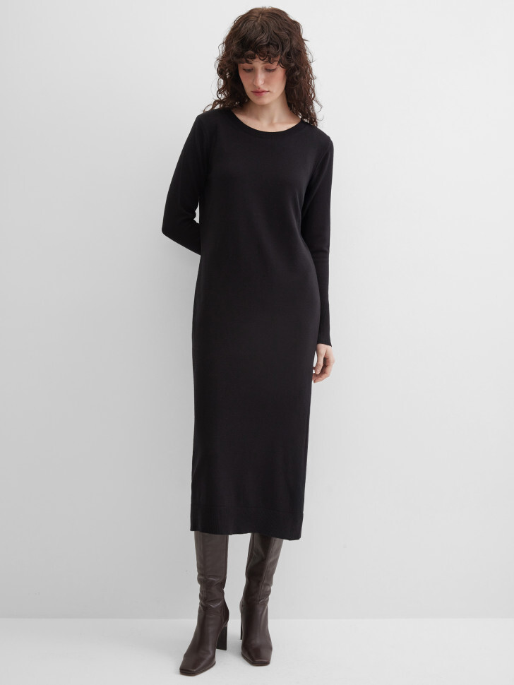 Трикотажное платье миди прямого полуоблегающего кроя из мягкой смесовой вискозы без застежек, с длинным втачным рукавом с манжетами, круглым вырезом и разрезом сзади.
