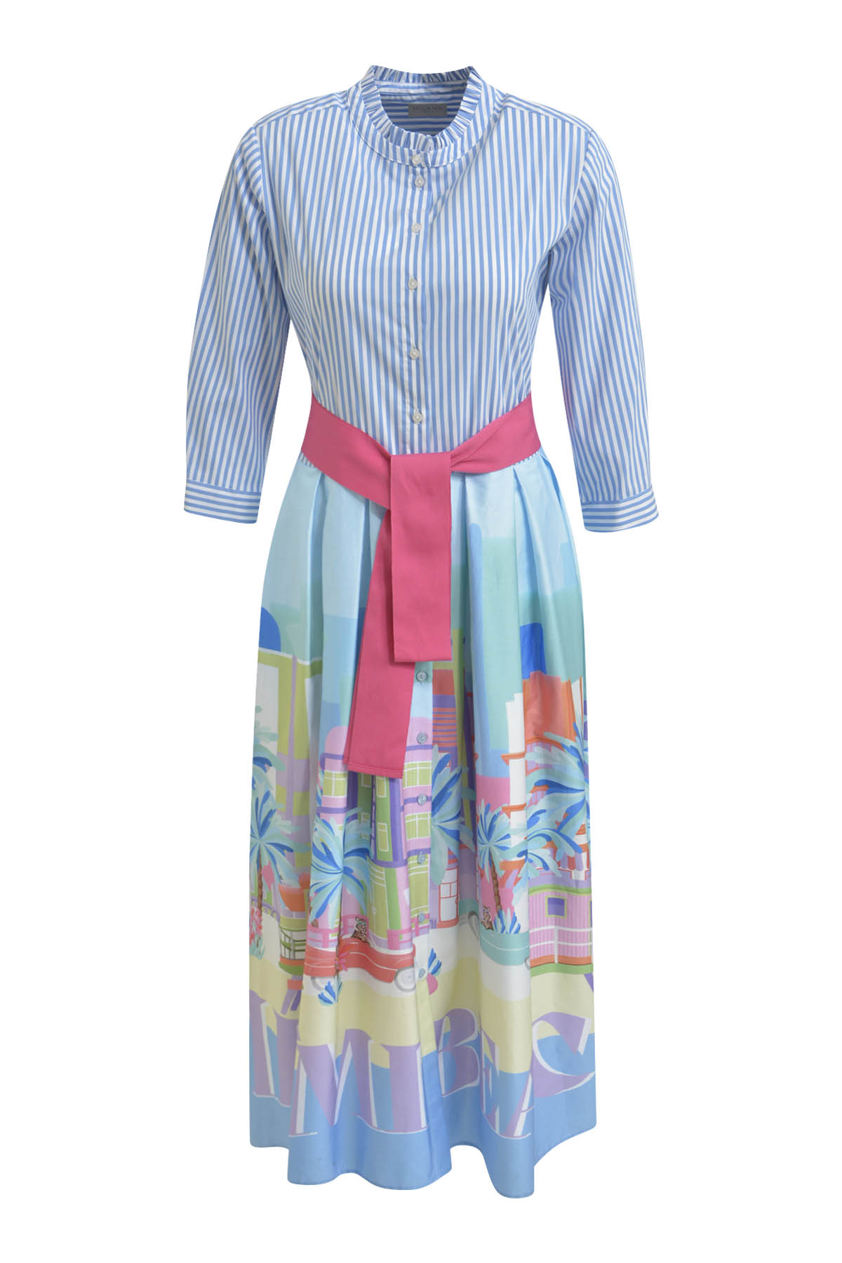 Хлопковое летнее платье миди в полоску и с абстрактным принтом на юбке, на широком поясе, с втачным рукавом 3/4, воротником-стойкой с рюшами, на пуговицах до талии.