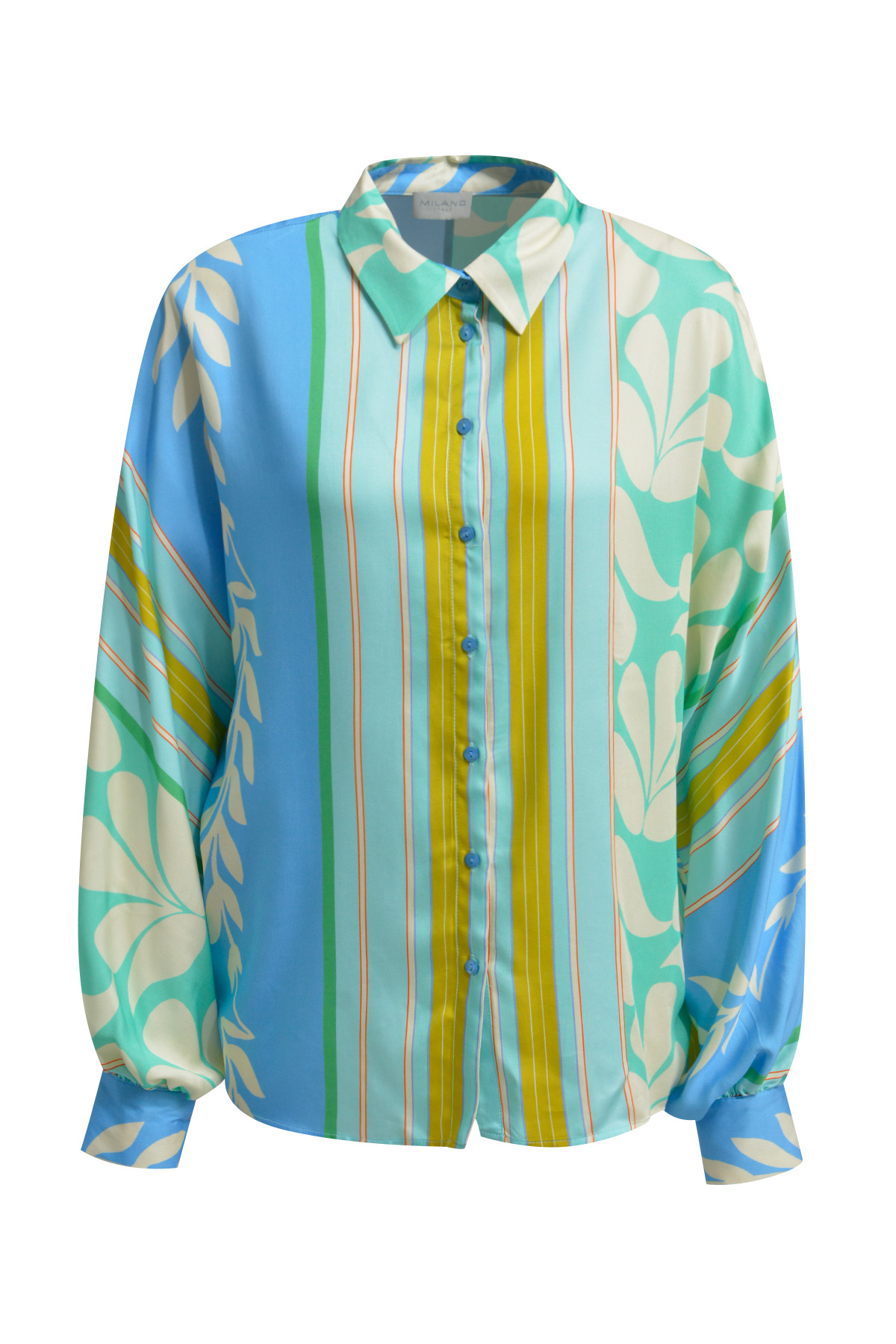 Разноцветная блуза прямого кроя из струящейся вискозы с абстрактным принтом из полосок, цветов и орнаментов привлекает внимание своим ярким и необычным дизайном. Цельнокроеные длинные рукава "летучая мышь" создают свободный и стильный силуэт. Модель с отложным воротником, застёгивается на пуговицы, что придаёт ей элегантности и универсальности. Эта блуза идеально подходит для создания выразительных и оригинальных образов, добавляя ярких акцентов в любой стиль.