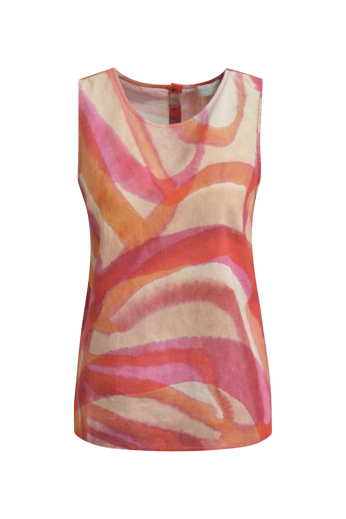 Приталенная блузка-топ без рукавов на широких бретелях с абстрактным принтом и округлым вырезом застежкой на пуговицы на спинке. Идеально для повседневной носки комфортный крой лёгкость ткани и продуманные детали делают эту модель практичным и стильным выбором на каждый день. Выполнено из приятного к телу качественного материала.