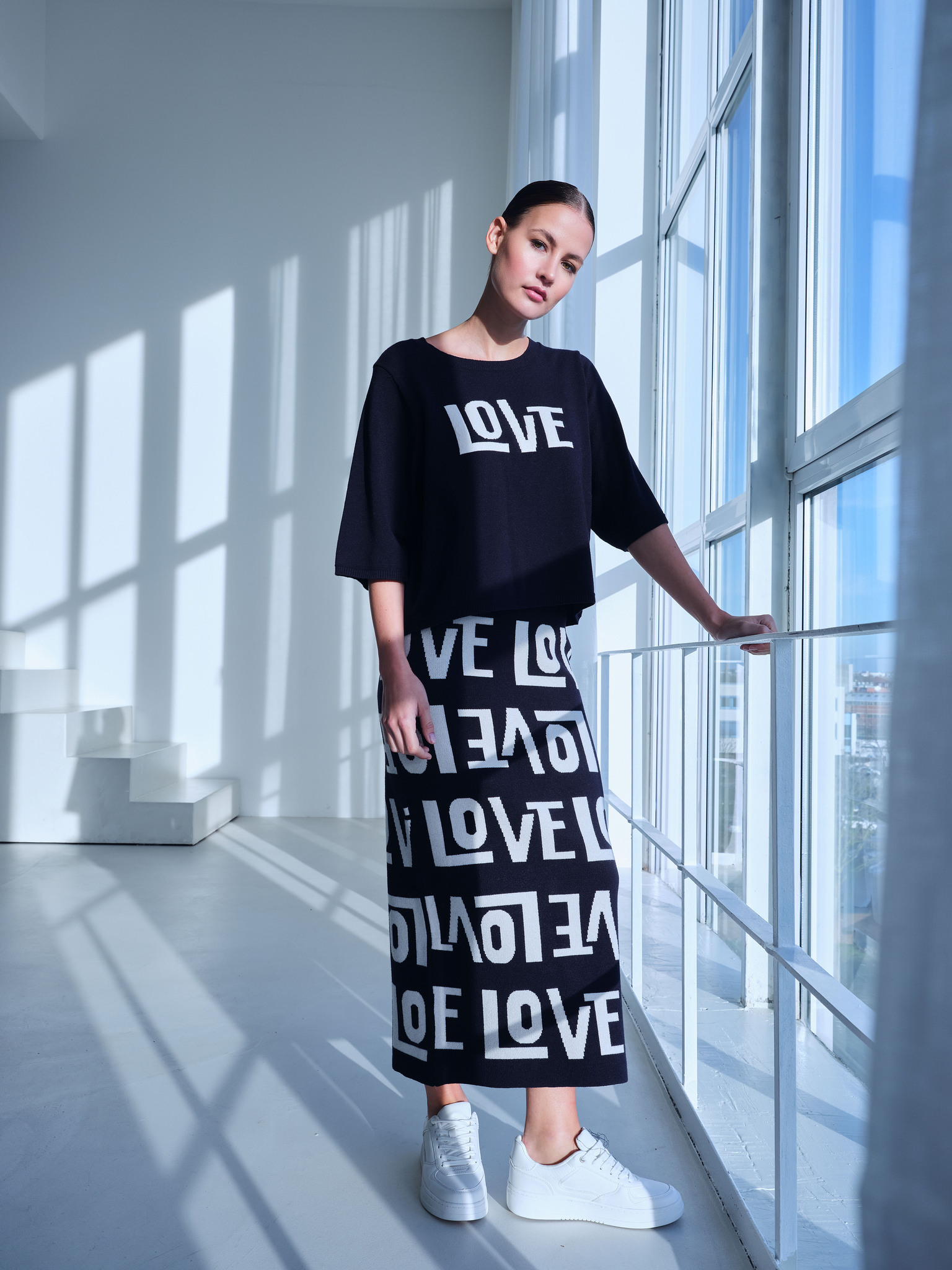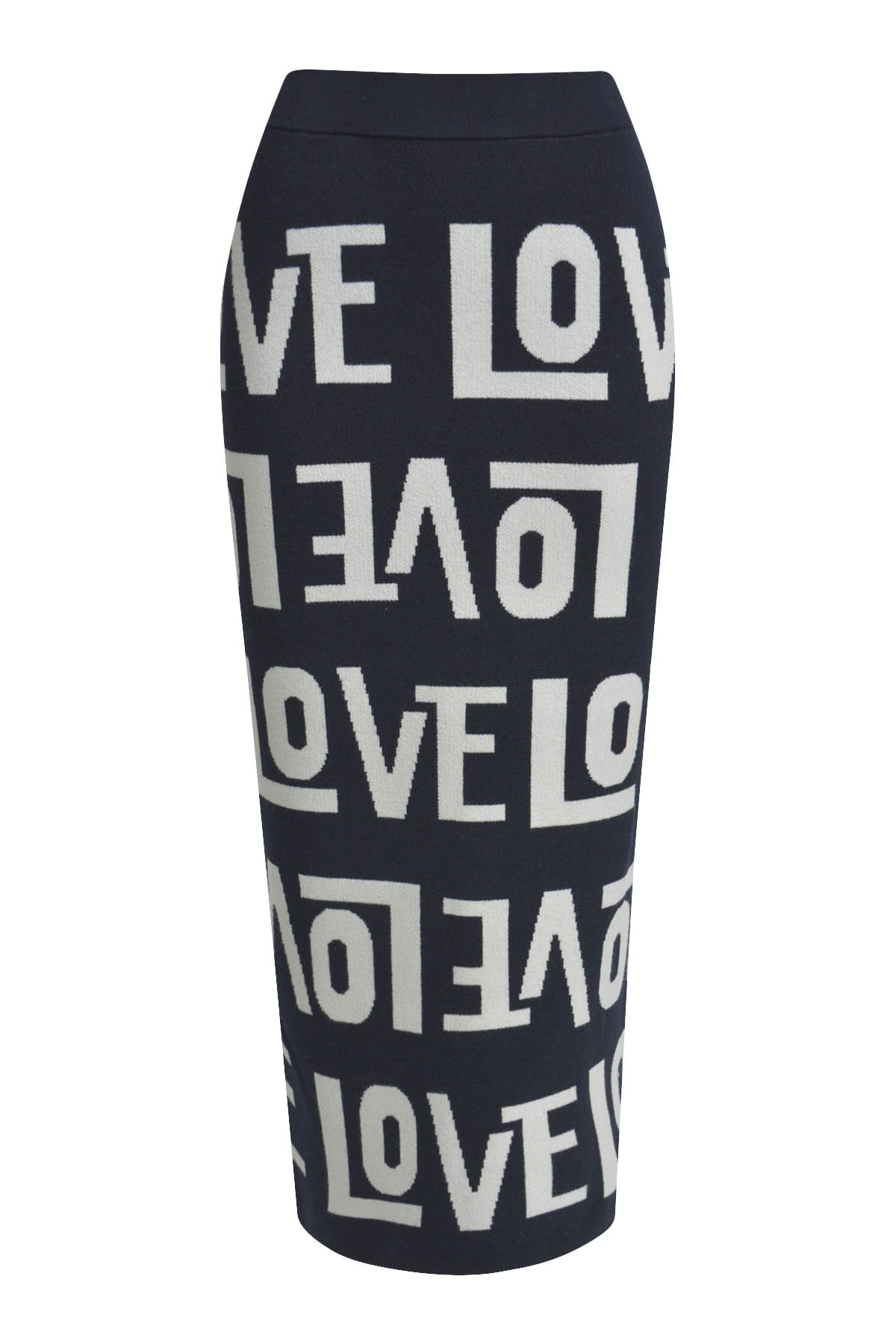 Полуприлегающая прямая юбка миди карандаш из мягкой смесовой тянущейся вискозы на резинке, с принтом надписями и разрезом сзади.