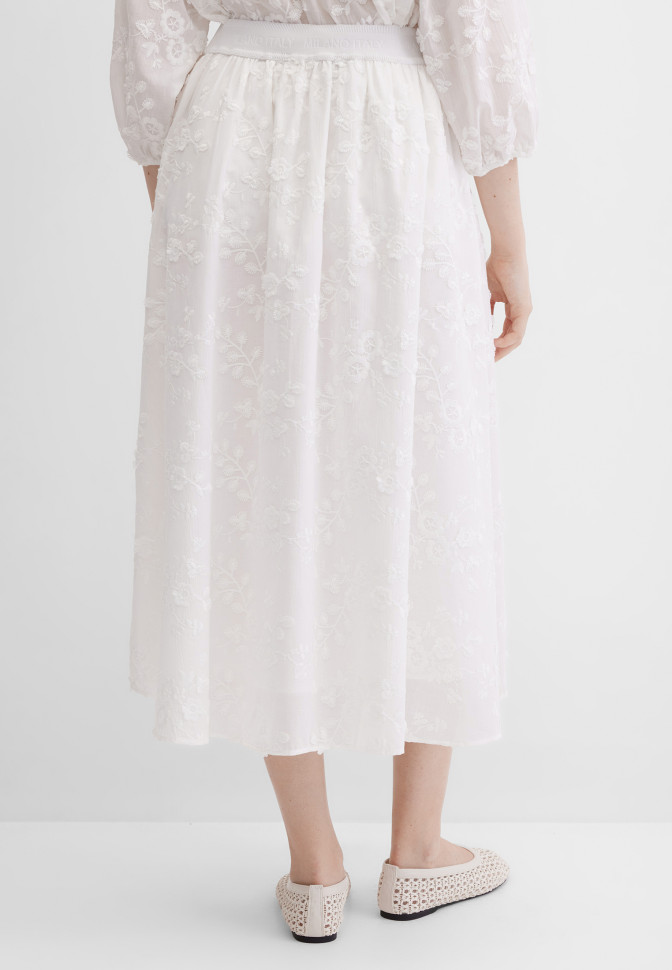 Длина – 76 см. Юбка миди А-силуэта с цветочной вышивкой станет ярким акцентом в вашем гардеробе. Свободный крой и сборки придают ей легкость и воздушность, а эластичный пояс-резинка с брендированной надписью и мягкая подкладка в тон обеспечивают идеальную посадку и дополнительный комфорт в течение дня. Отрезные карманы, отсутствие застежки делает модель еще более удобной. Изготовленная из приятного, легкого, смесового хлопка с романтичной вышивкой, эта юбка - идеальный выбор для создания стильных и нарядных образов на каждый день и на выход.