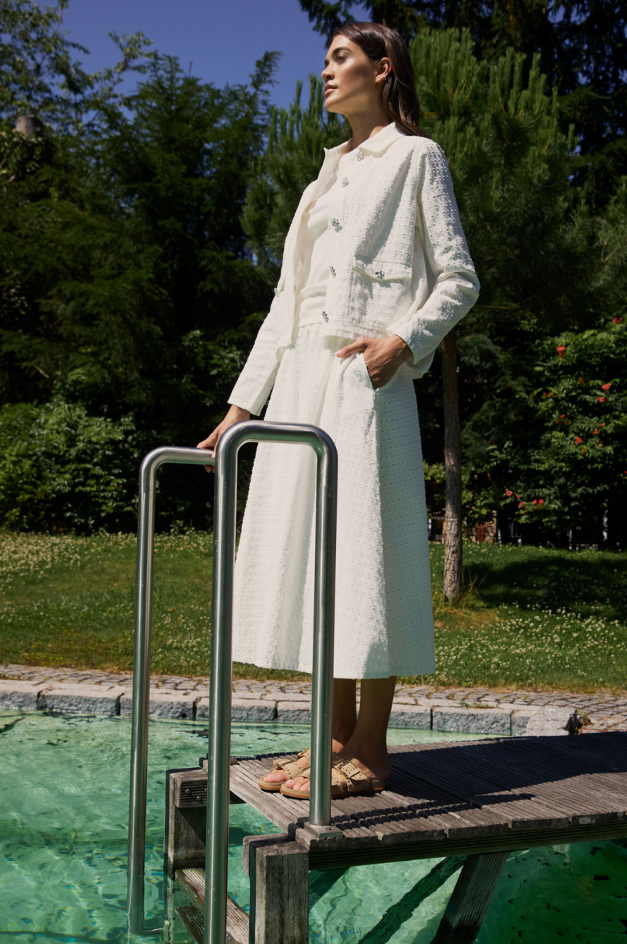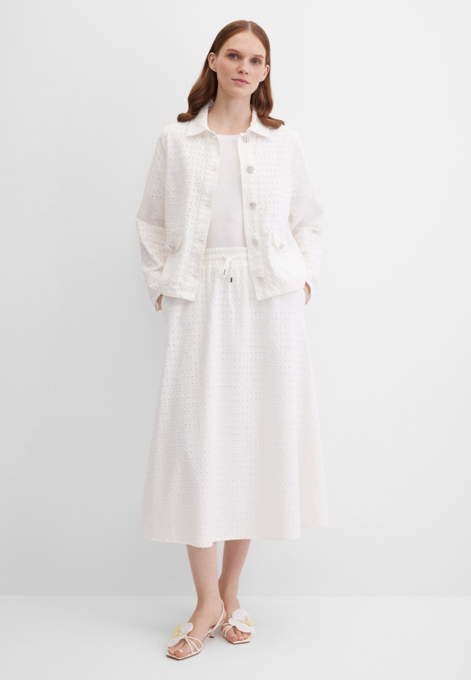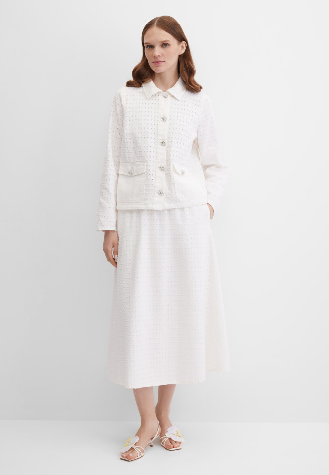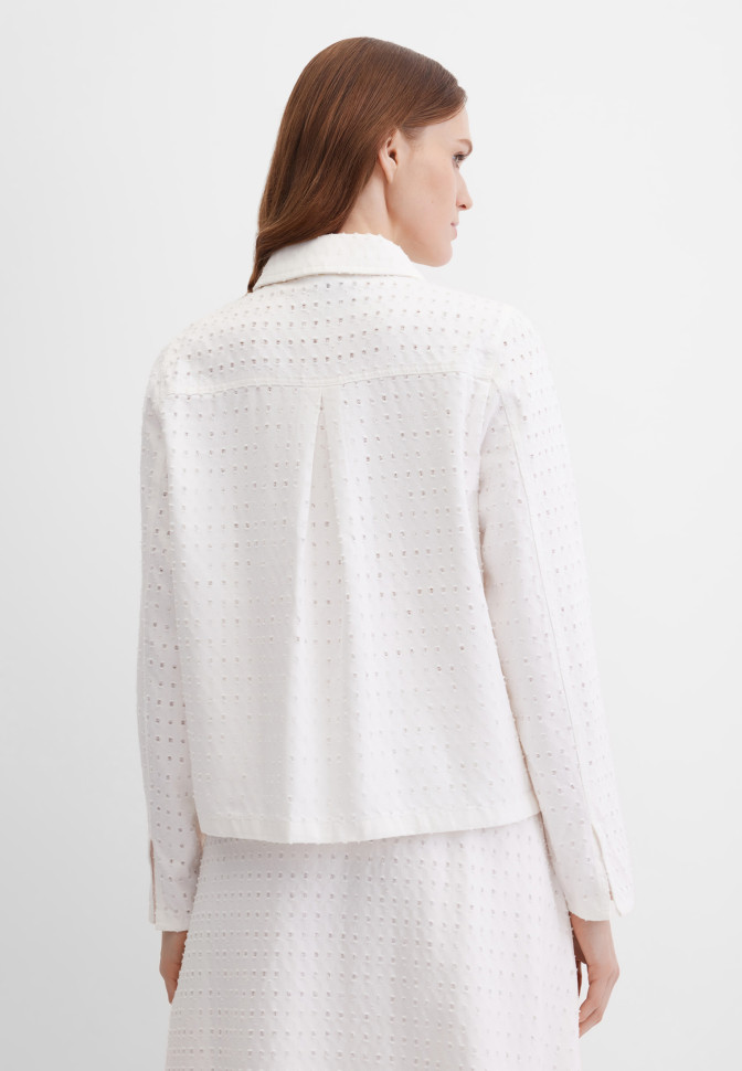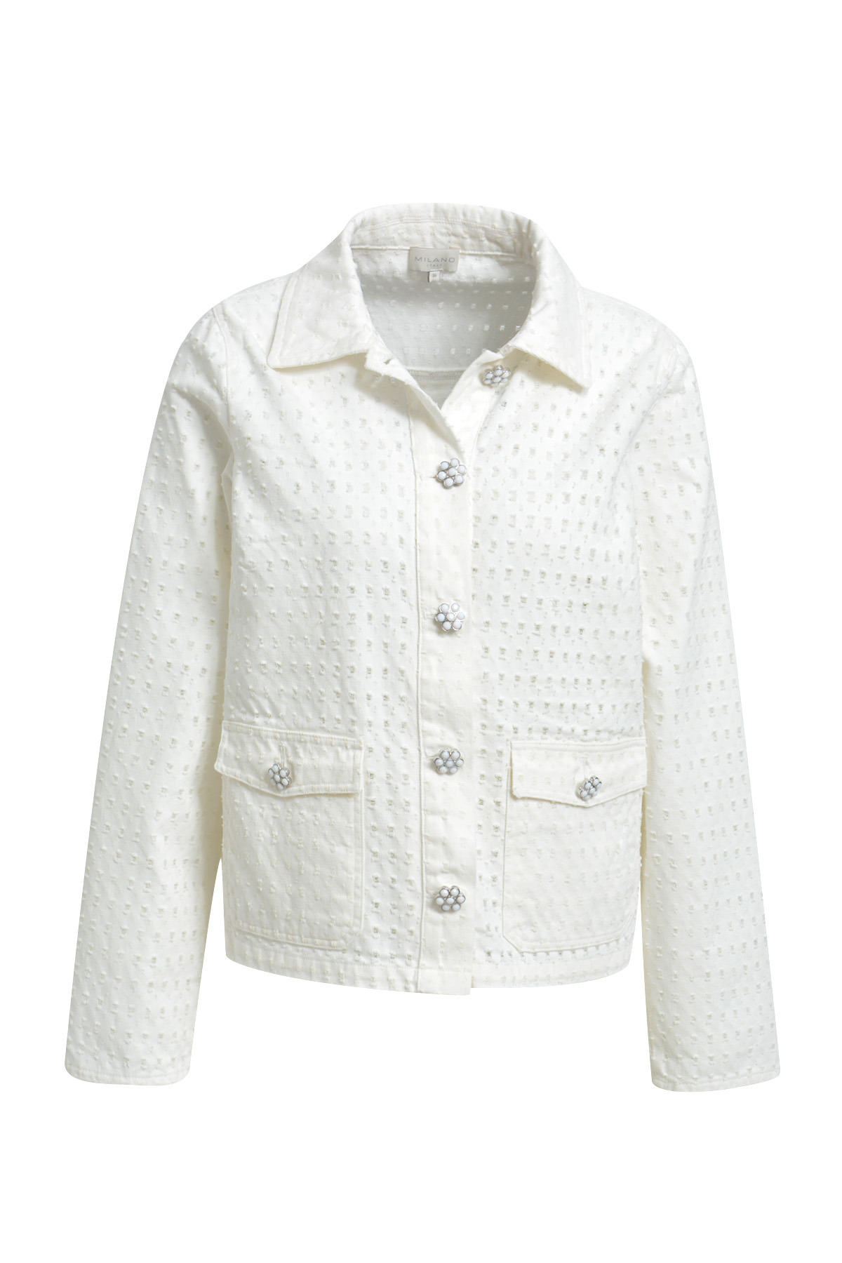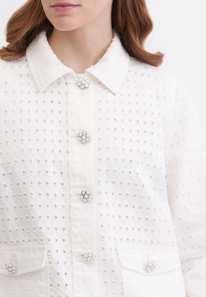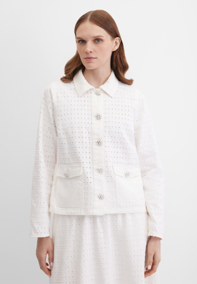 Длина по спинке – 57 см. Прямая укороченная куртка из стопроцентного хлопка под деним с декоративной микроперфорацией, создающей лёгкий, дышащий эффект. Декоративные акцентные пуговицы и необработанные края перфорации добавляют изделию трендовый винтажный характер. Карманы с клапанами на пуговицах, отложной воротник, кокетка и защип по спинке формируют аккуратный силуэт. Разрезы на рукавах позволяют варьировать длину, открывая запястья. Модель без подкладки — лёгкая, пластичная и комфортная для носки. Комплект с арт. 2458-1440
