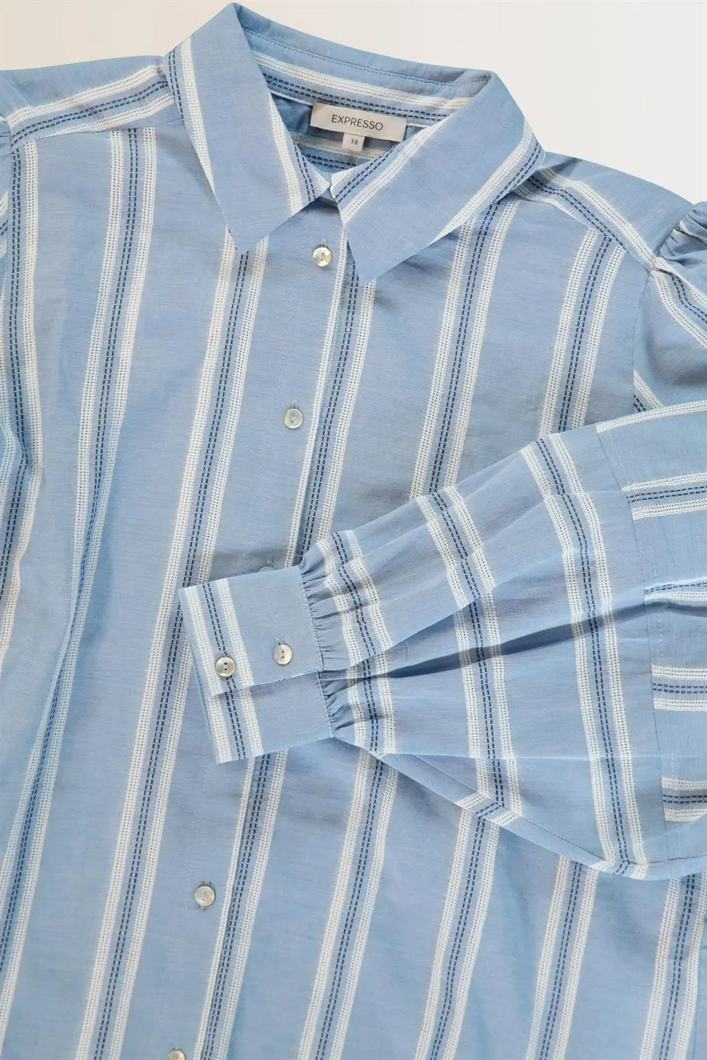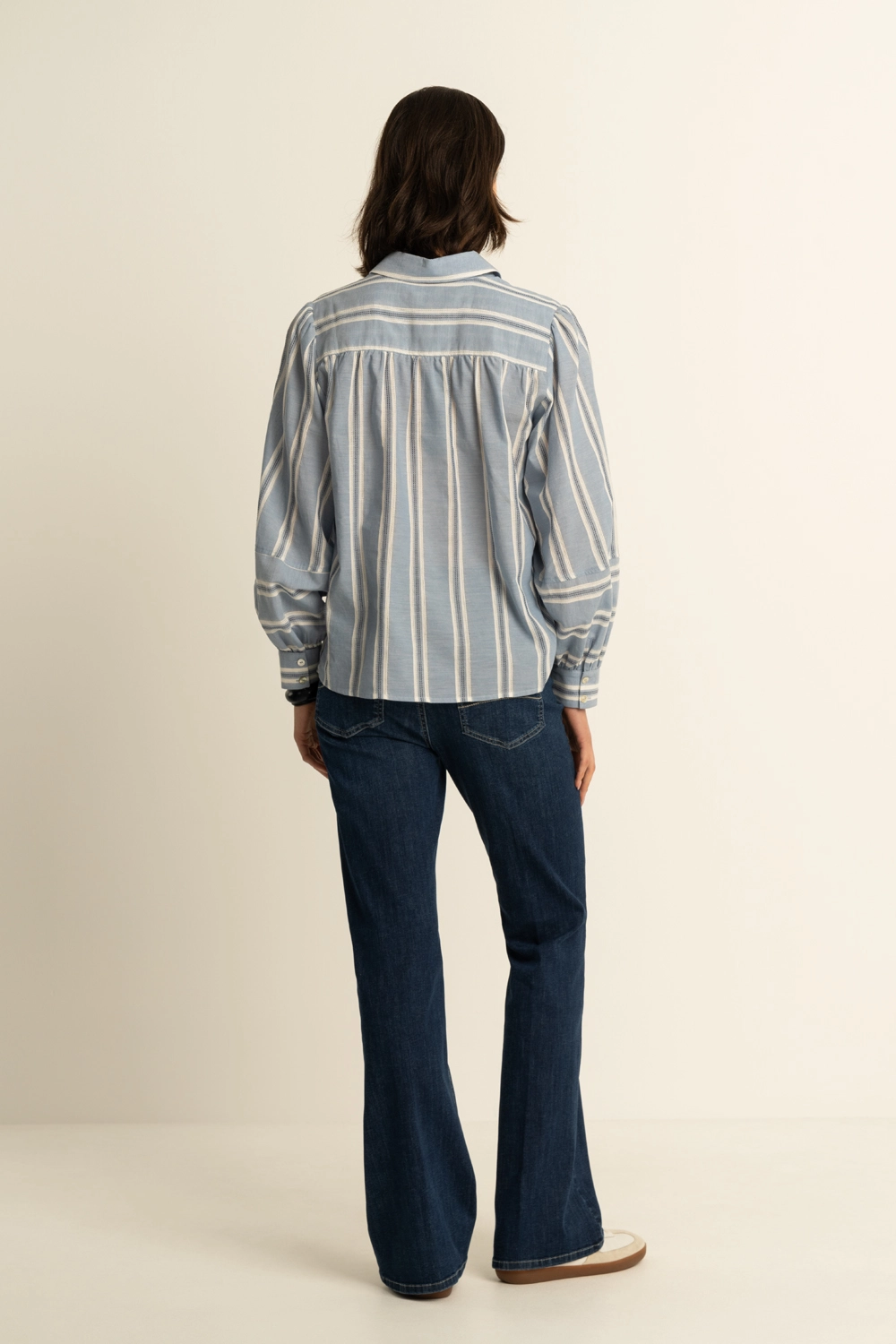 Светло-голубая полосатая блузка – из легкого хлопка с жаккардовыми полосками. Прямой и удобный крой, классический воротник, застежка на пуговицы и женственные рукава-фонарики. Нежная полоска придает блузке свежий, современный вид, а объемные рукава создают выразительный силуэт.