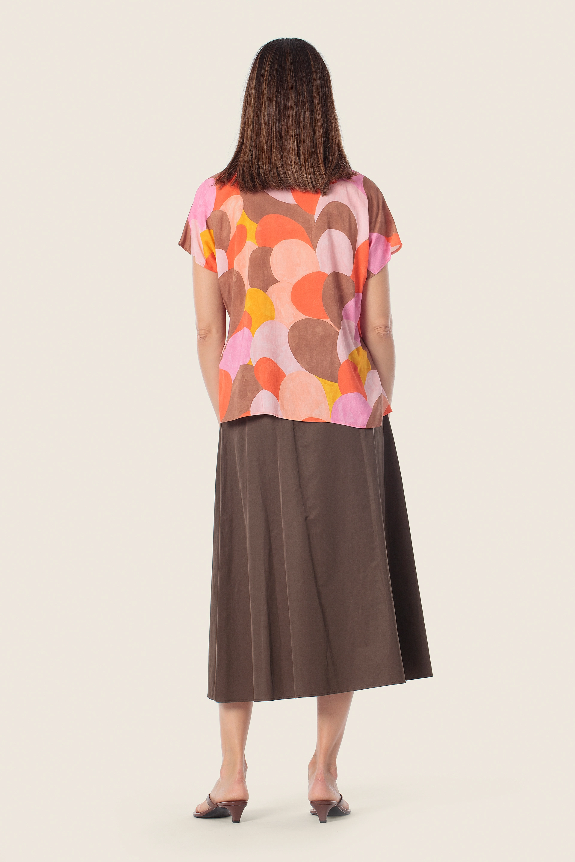 Эта многоцветная блузка свободно ниспадает вдоль тела и заканчивается на бедре. V-образный вырез с небольшой складкой спереди придает дизайну женственный акцент, а короткие рукава создают эффект воздушности. Абстрактный круговой принт придает блузке современный вид, идеально подходящий как для работы, так и для отдыха.