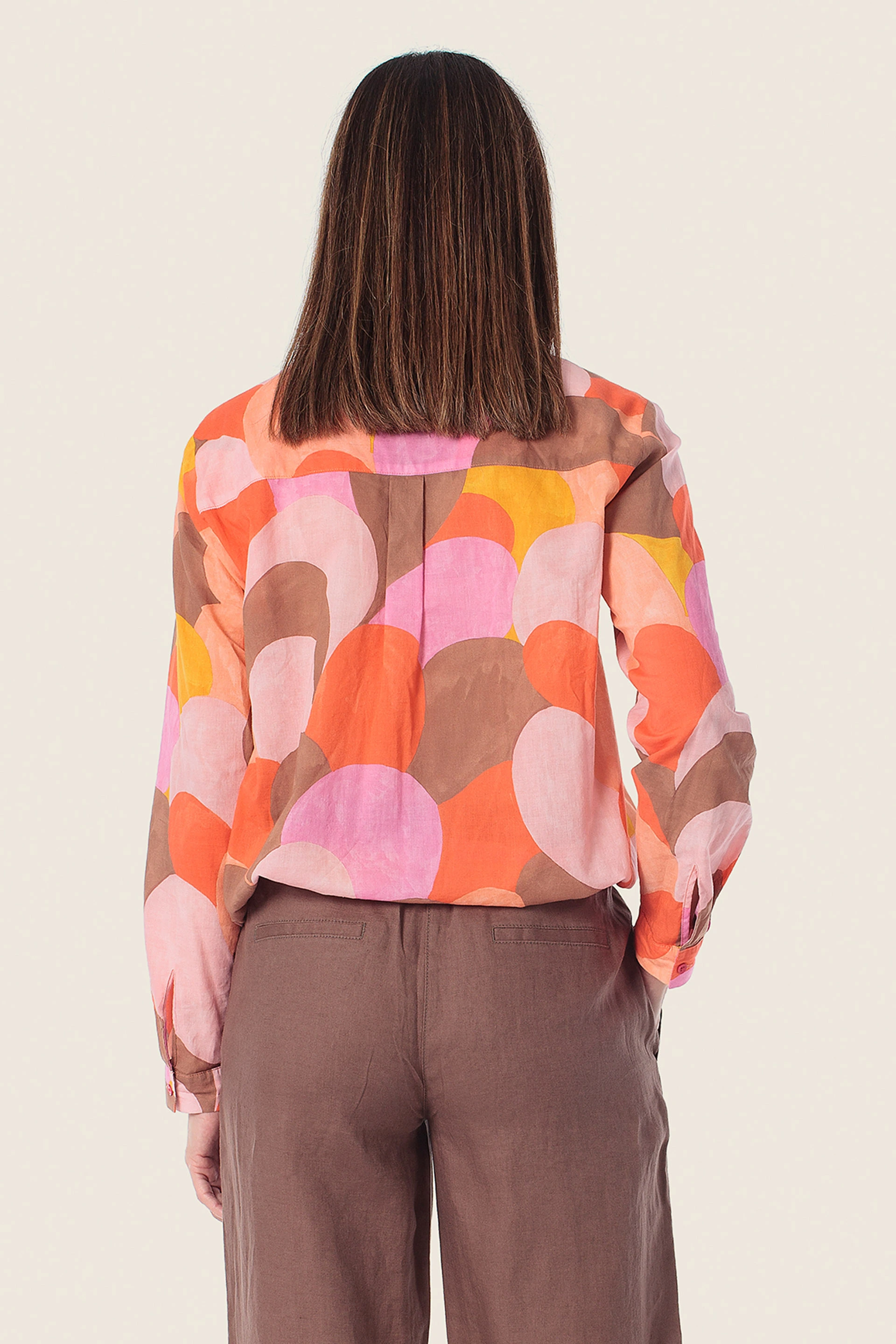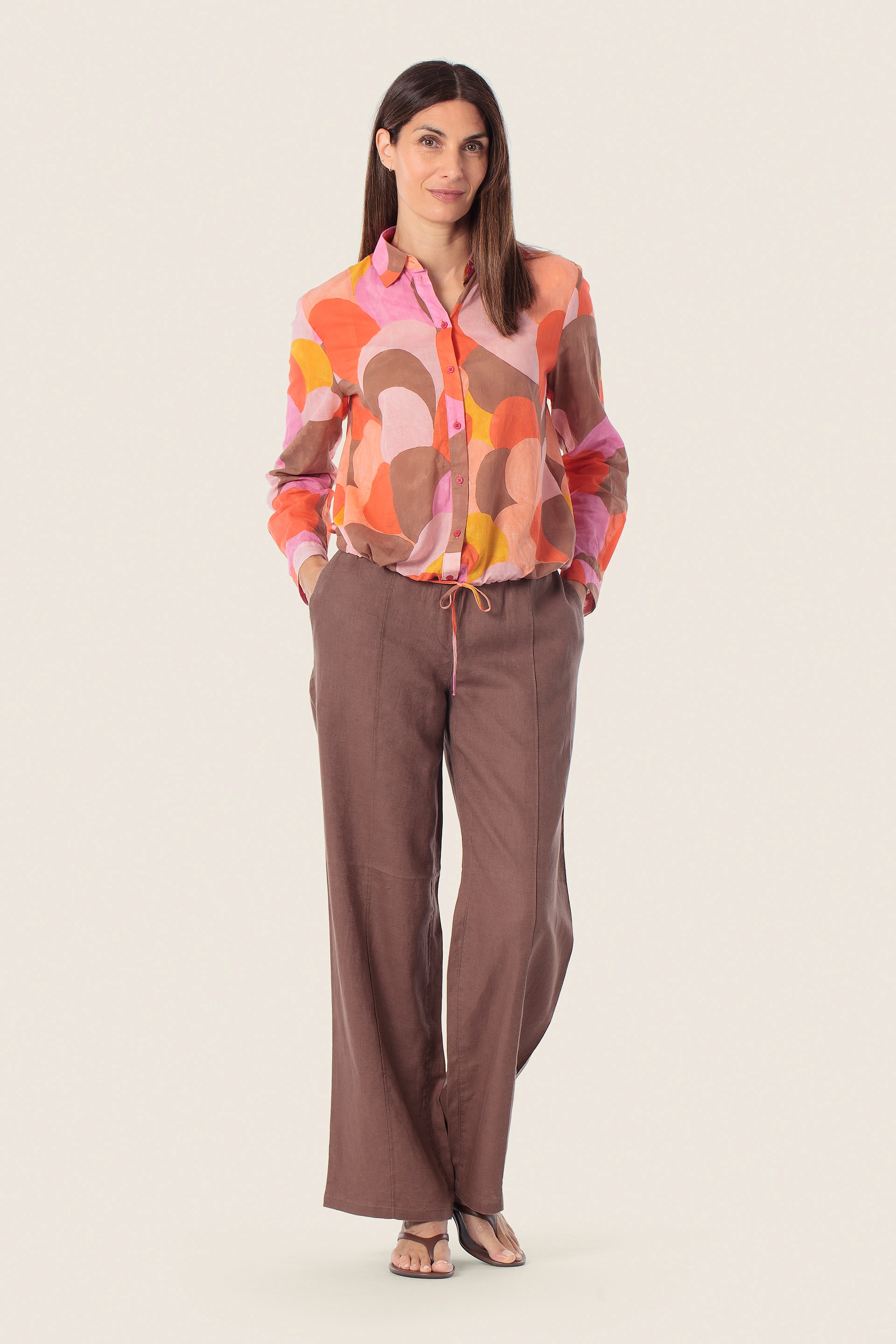 Эта блузка с ярким графическим принтом свободного покроя придает ей свежий современный вид. Классический воротник и застежка на пуговицы создают вневременной акцент, а завязки на подоле создают красивый силуэт. Идеально сочетается с брюками или джинсами, от работы до выходных.