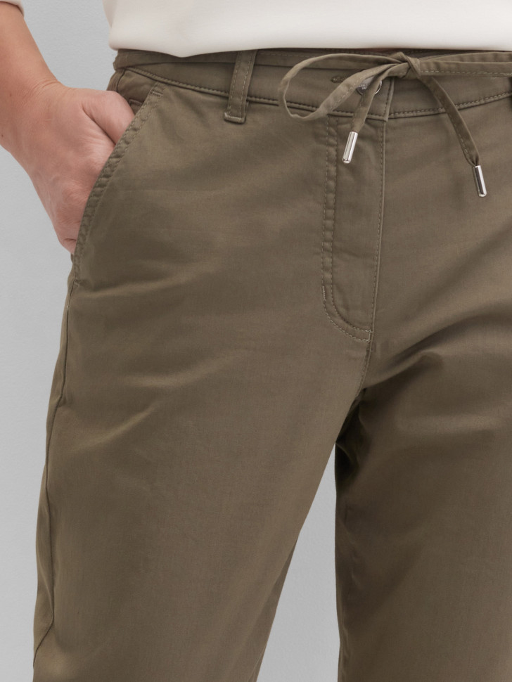 Брюки чинос зауженного укороченного кроя изготовлены из мягкого эластичного смесового хлопка, приятного к телу и хорошо держащего форму. Эластичный пояс со шлёвками обеспечивает комфортную посадку, а тонкий поясок-завязка добавляет стильный акцент и помогает регулировать объём. Застёжка на молнию и брендированную пуговицу сохраняет классический подход. Косые карманы делают модель практичной, а кокетка и фальш-карманы сзади формируют аккуратную линию спинки. Подвороты придают расслабленный характер образу, при этом их можно отвернуть для увеличения длины. Отличный выбор для casual-луков, прогулок и современного повседневного стиля.