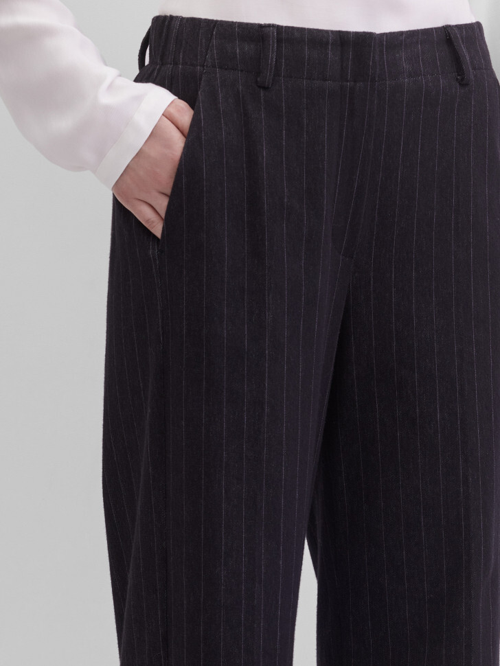 Длина по внутреннему шву 80 см., ширина низа брючин 48 см. Классические прямые брюки из ткани в полоску с застёжкой на молнию. Строгий крой и вертикальный рисунок визуально вытягивают силуэт, подчёркивая элегантность и сдержанность образа. Идеальный выбор для делового гардероба и повседневной классики.