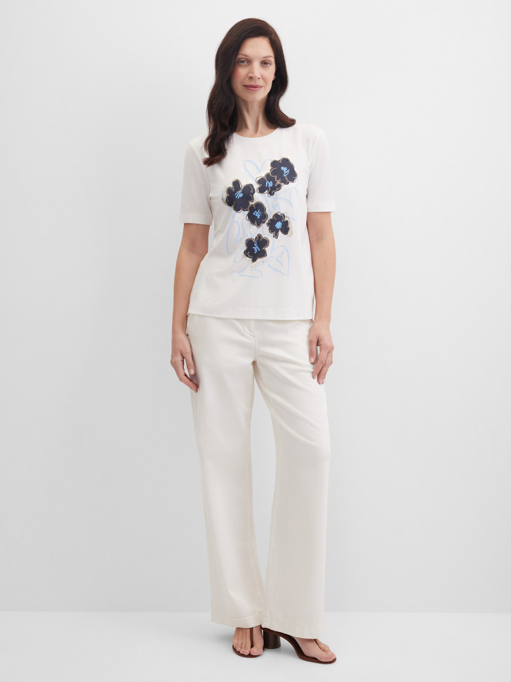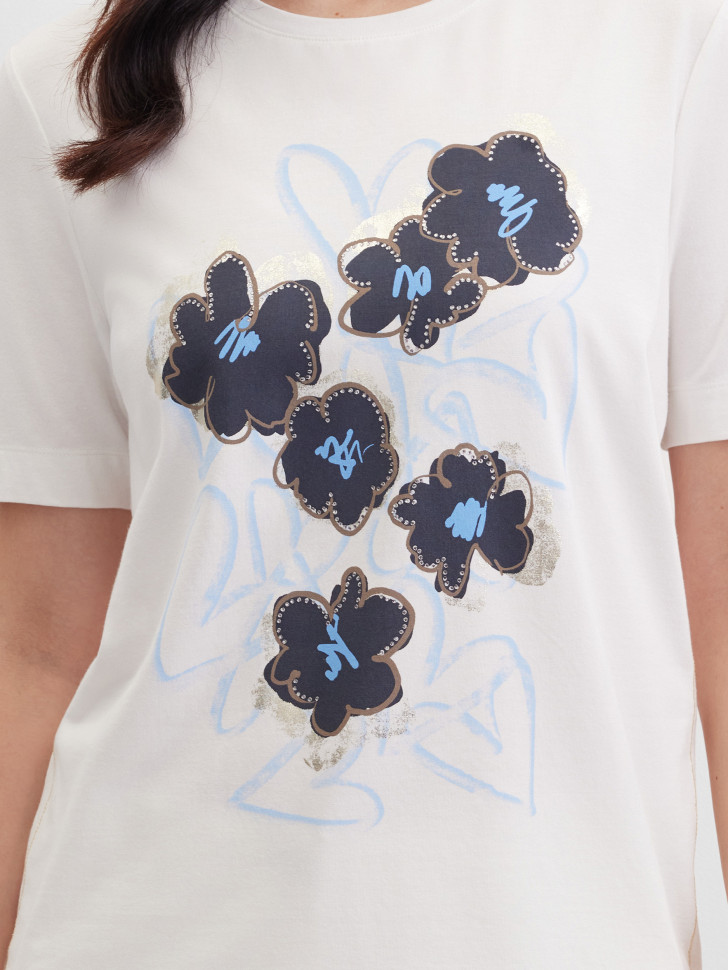 Футболка прямого кроя изготовлена из мягкого смесового эластичного хлопка с модалом, дышащего, приятного, комфортного в течение дня. Акцент этой модели сделан на печатном цветочном рисунке с металлизированным напылением, дополненном стразами, добавляющими мерцающий декоративный эффект. Тонкая блестящая нить вдоль боковых швов деликатно подчеркивает линии силуэта. Короткие рукава, классический круглый вырез поддерживают универсальность модели. Небольшая брендированная надпись с изнаночной стороны у линии выреза подчеркивает внимание к деталям. Футболка подходит для повседневных выходов, встреч, поездок и активного ритма города.