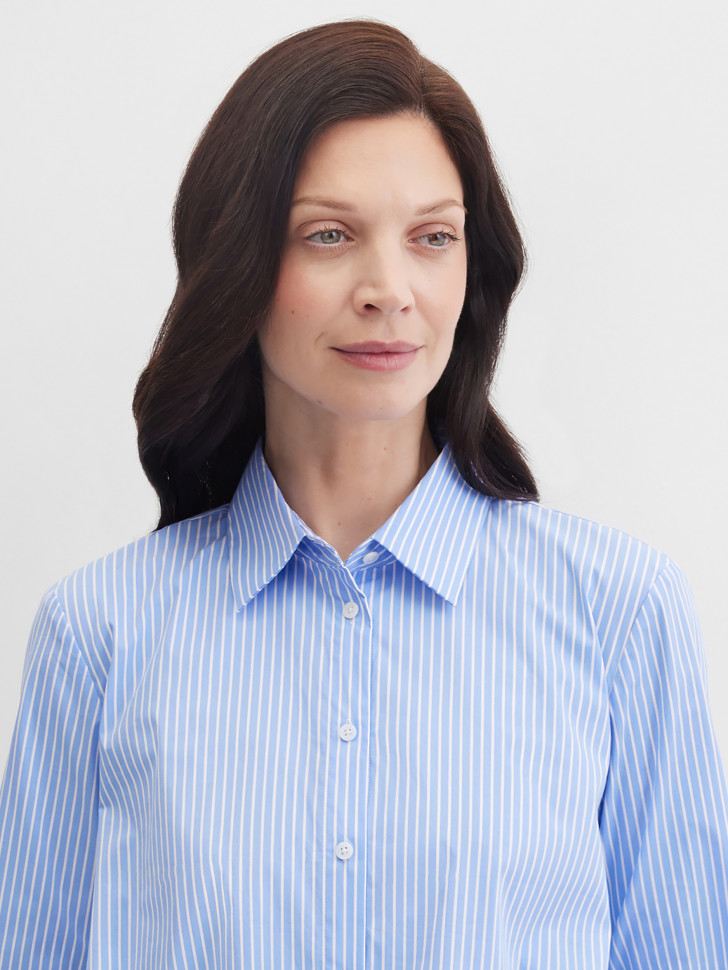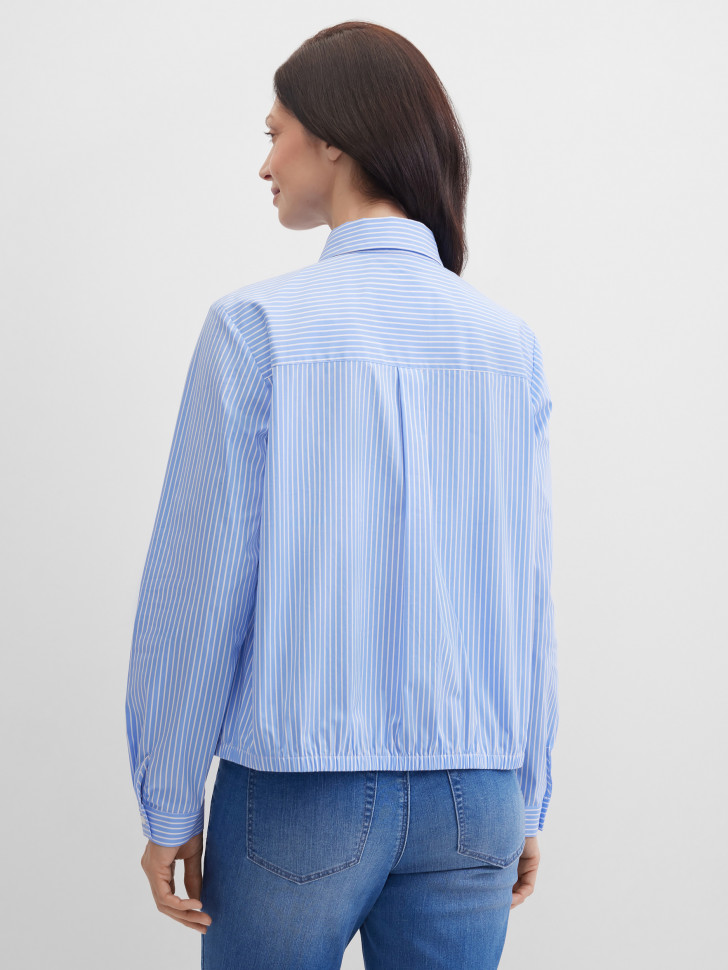 Блузка-рубашка укороченная свободного кроя изготовлена из смесового хлопка в полоску, который сочетает натуральную воздухопроницаемость с эластичностью и устойчивостью к сминанию. Материал приятен к телу и хорошо держит форму. Отложной воротник и застёжка на пуговицах формируют чистую классическую линию верха, длинные рукава с манжетами позволяют носить модель в разных вариантах, варьируя длину. Оригинальные защипы по низу спереди создают структуру и делают силуэт более динамичным. Кокетка с защипом и эластичная резинка по низу спинки обеспечивают удобную посадку и подчёркивают необычный характер модели. Рубашка подойдёт для активных будней, работы в свободном офисном формате и городских выходов, когда хочется выглядеть нестандартно, не жертвуя комфортом.