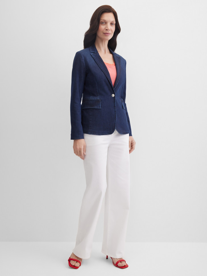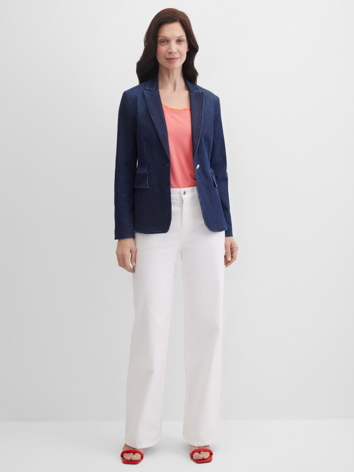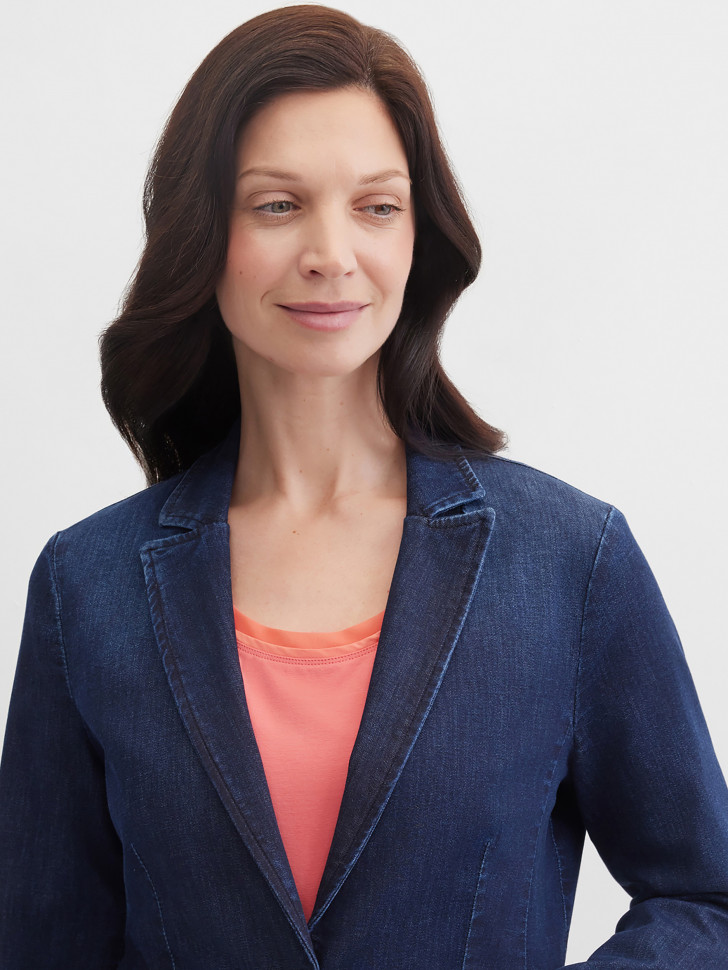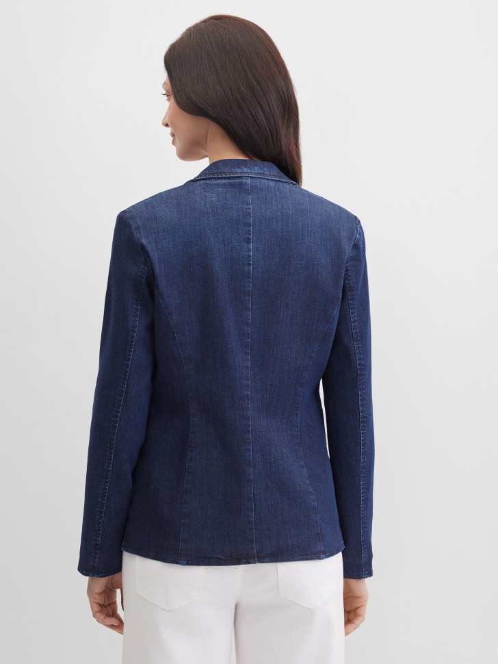 Жакет из смесового денима с лиоцеллом сочетает устойчивость ткани с мягкостью и комфортом при носке. Приталенный крой подчёркивает силуэт, сохраняя при этом свободу движения. Английский воротник и карманы с клапанами придают модели аккуратную структурность, а блестящая фактурная пуговица добавляет выразительный акцент. Подклад обеспечивает комфорт и аккуратную посадку, задний шов формирует чистую линию спинки. Жакет подходит для повседневных и городских образов, создавая аккуратный и современный внешний вид.