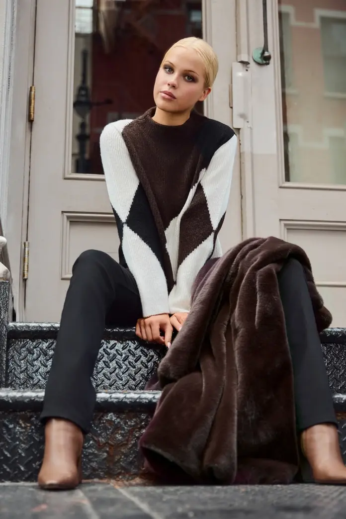 Элегантный вязаный джемпер с ромбовидным узором, мерцающими пайетками и слегка приспущенными плечами для стильных образов.