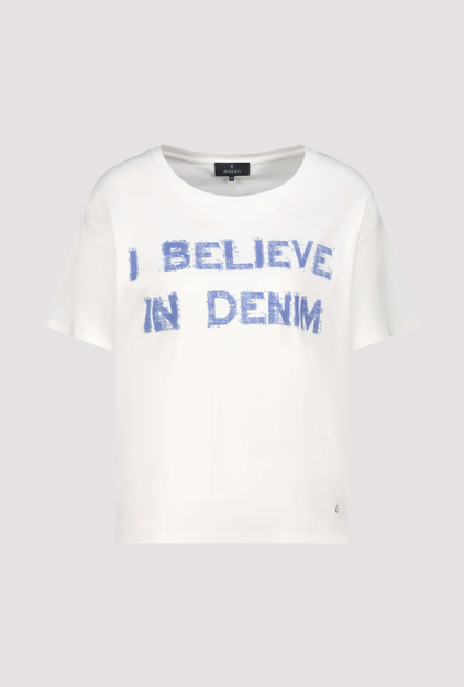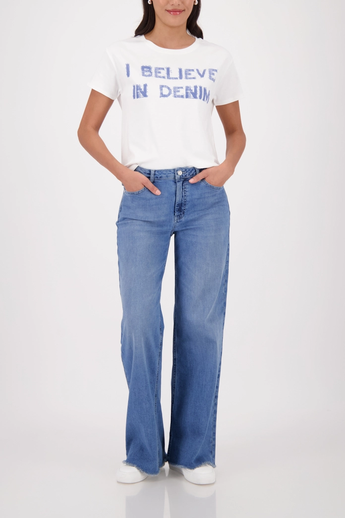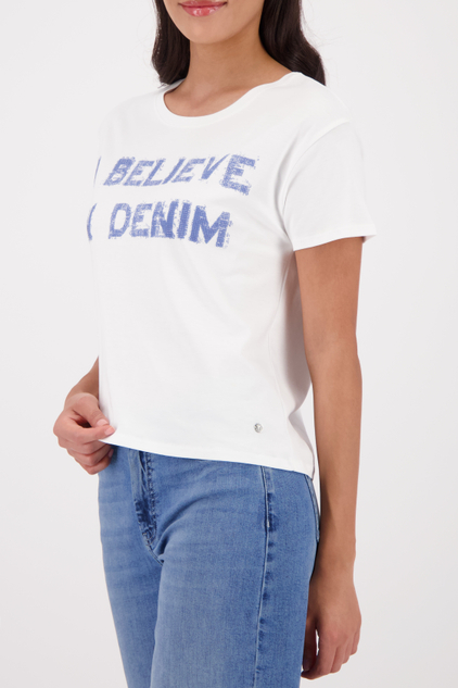 Стильная футболка из 100% хлопка с надписью «Я верю в деним», стразами, мягкой текстурой и круглым вырезом.