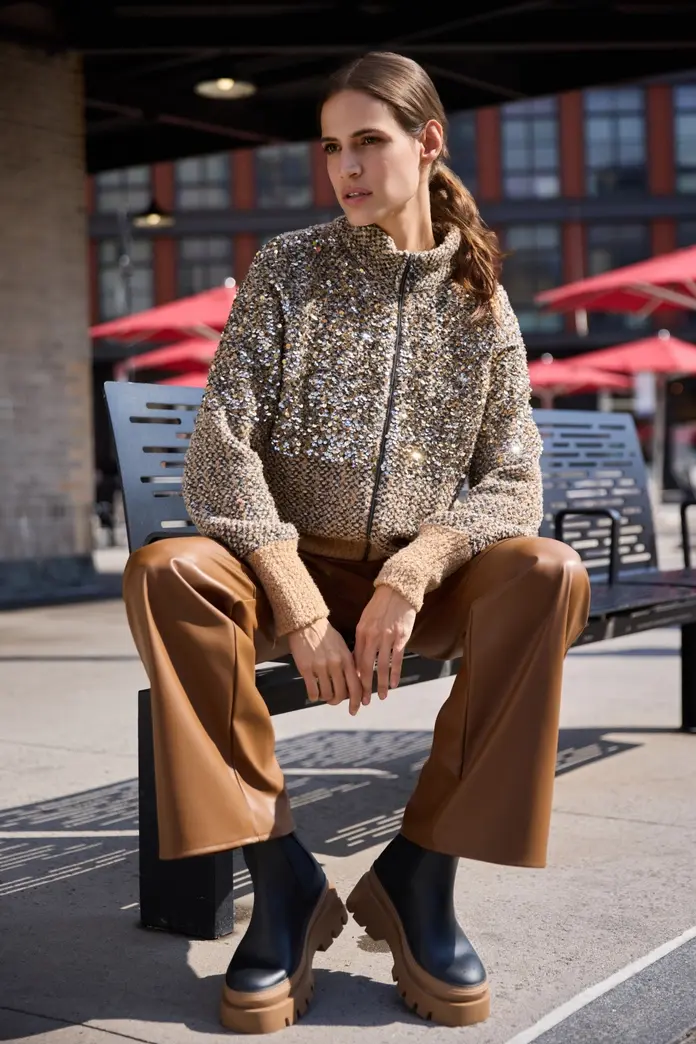 Представляем вашему вниманию стильный кардиган с мерцающими пайетками, изготовленный из высококачественной смесовой хлопковой ткани с элегантной твидовой текстурой.