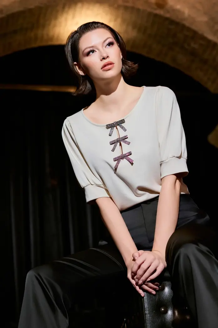 Элегантная толстовка из струящейся вискозы с блестящим бантом из страз, который придаёт образу стильный вид.