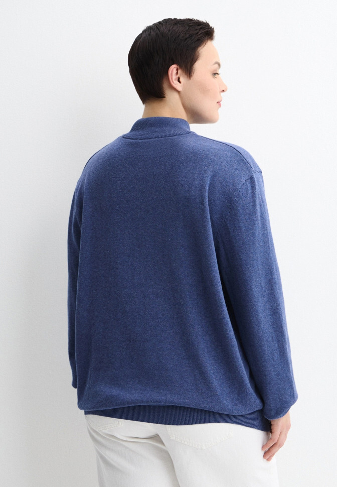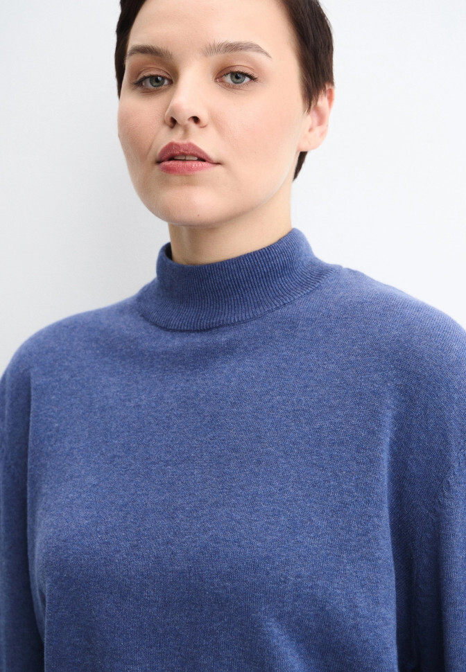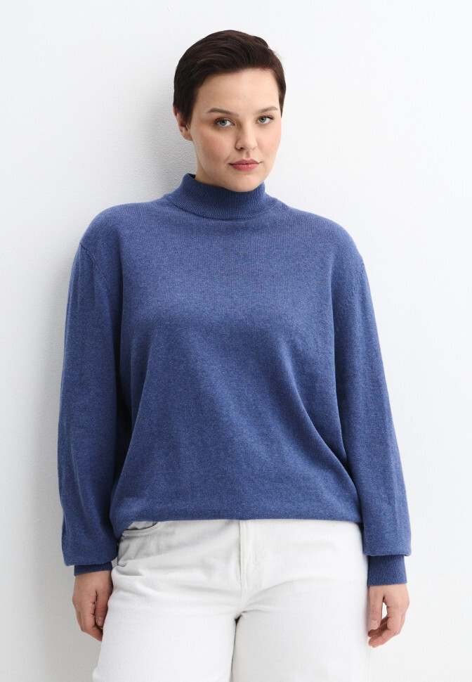 Длина по спинке 68 см. Джемпер полуприлегающего прямого кроя выполнен из мягкой смесовой вискозы, с длинными рукавами и воротником-стойкой, декорированным стразами, что добавляет акцент и подчёркивает сдержанную элегантность. Подходит как для повседневных, так и для более нарядных образов.