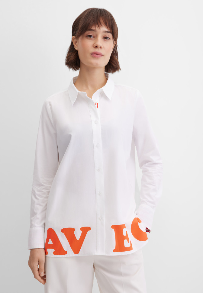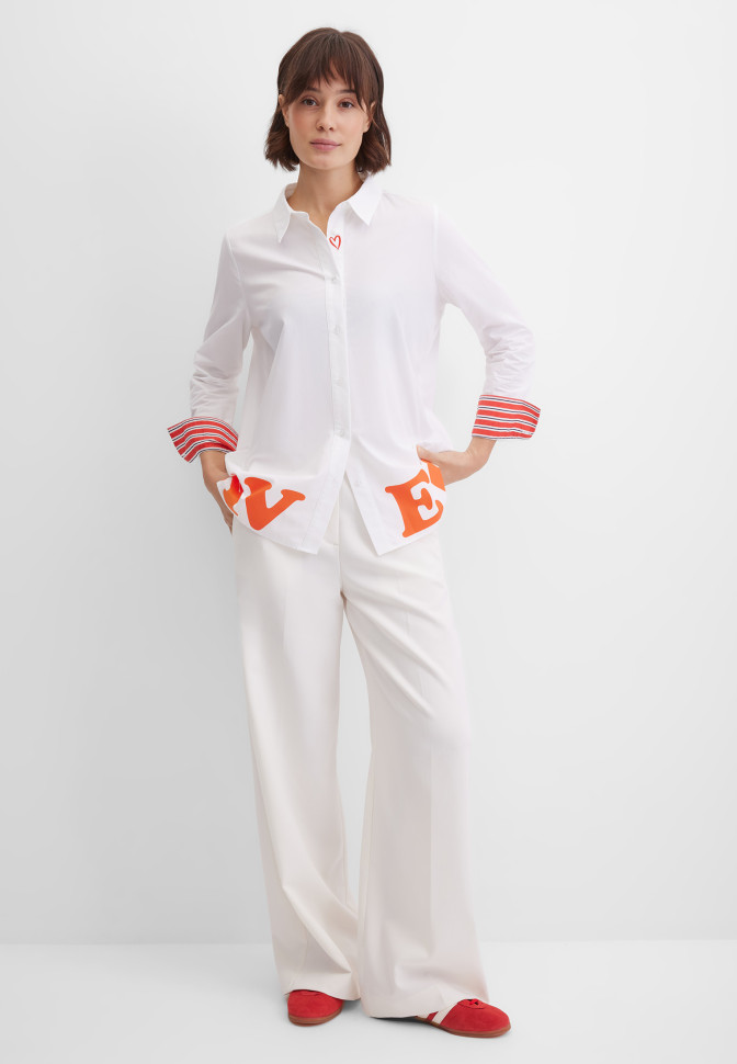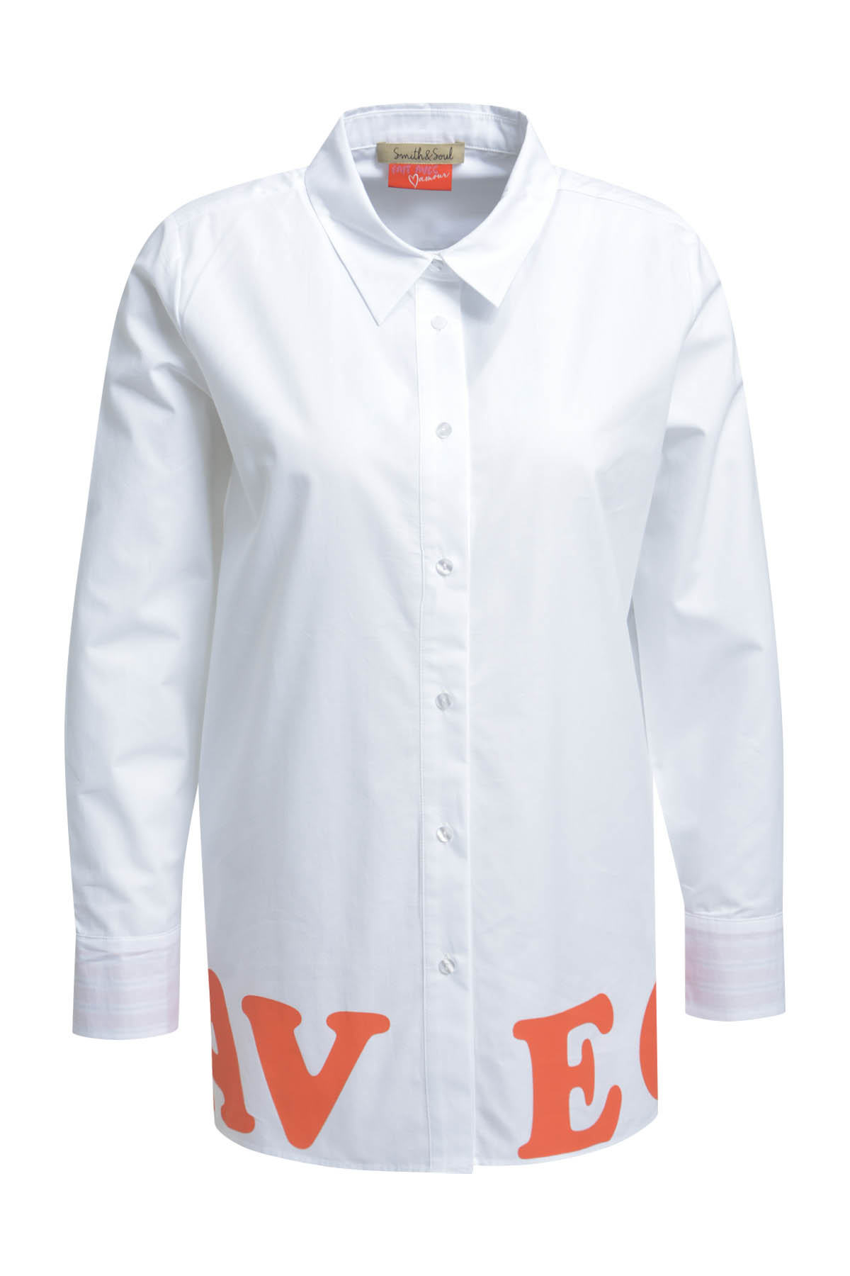 Длина по спинке – 70 см. Удлинённая блузка прямого кроя из стопроцентного хлопка, комфортного и дышащего. Модель на пуговицах с аккуратным отложным воротником и длинным втачным рукавом с манжетами на пуговицах. Манжеты оформлены контрастной полоской с изнанки, что создаёт деликатный декоративный акцент. На планке пуговиц — миниатюрная вышивка-сердечко. Кокетка на спинке с мягкими защипами обеспечивают аккуратную посадку по плечам. Нижняя часть дополнена крупной акцентной надписью и разрезами по бокам, что делает силуэт более выразительным и обеспечивает комфорт при активных движениях. Благодаря расслабленному силуэту, сочетанию натуральной фактуры и оригинального дизайна эта стильная блузка-рубашка подходит для повседневных, кэжуальных образов, а также офиса без строгого дресс-кода.