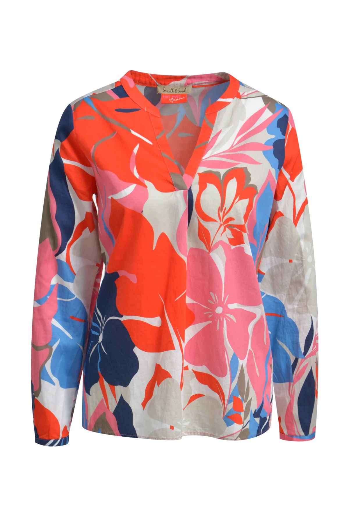 Блузка свободного прямого кроя из стопроцентного хлопка с ярким цветочным принтом. Модель без застёжки, с длинными рукавами с манжетами. V-образный вырез с деликатным защипом визуально вытягивает силуэт и подчеркивает линию шеи. Закругленный край формирует лёгкий, завершенный силуэт, а нежная ткань обеспечивает приятное ощущение при носке. Универсальная хлопковая блузка, которая отлично подходит для прогулок, повседневных образов, неформального офиса и летних выходов.