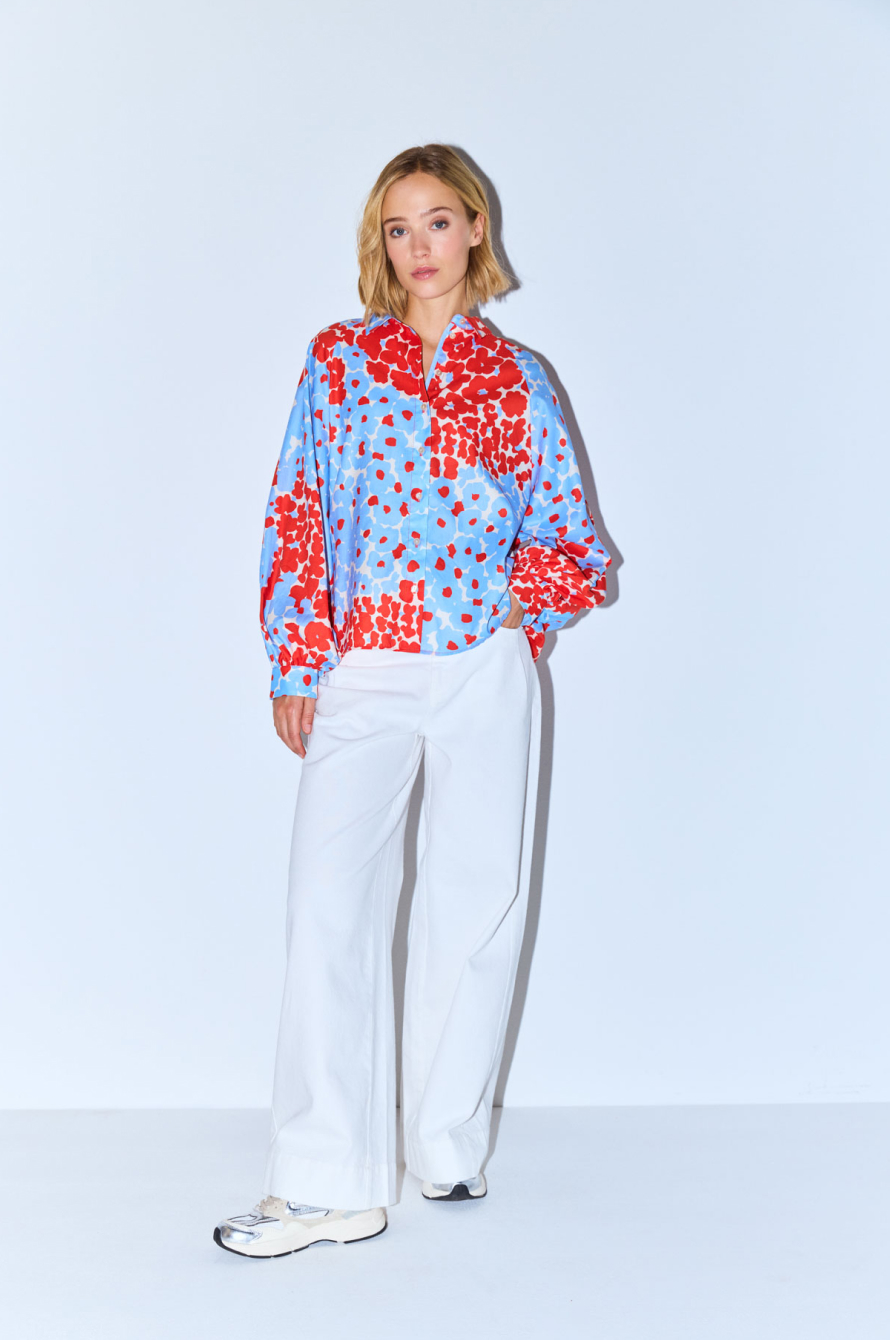 Длина по спинке – 63 см. Стильная свободная блузка из натурального хлопка в ярком цветочном принте. Прямой крой и лёгкая ткань обеспечивают комфорт и свободу движений. Модель с отложным воротником, застегивается на пуговицы. Длинные объемные рукава реглан, присборенные к манжетам на пуговицах, создают мягкий силуэт. Эта стильная рубашка идеально подходит для повседневных образов, города и путешествий — лёгкая, воздушная и комфортная.