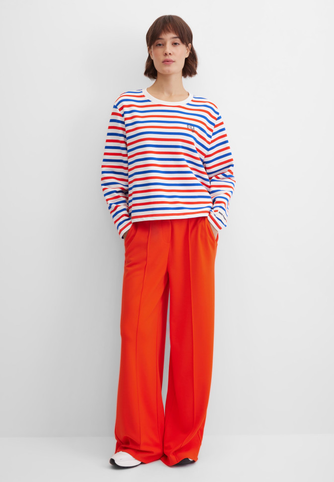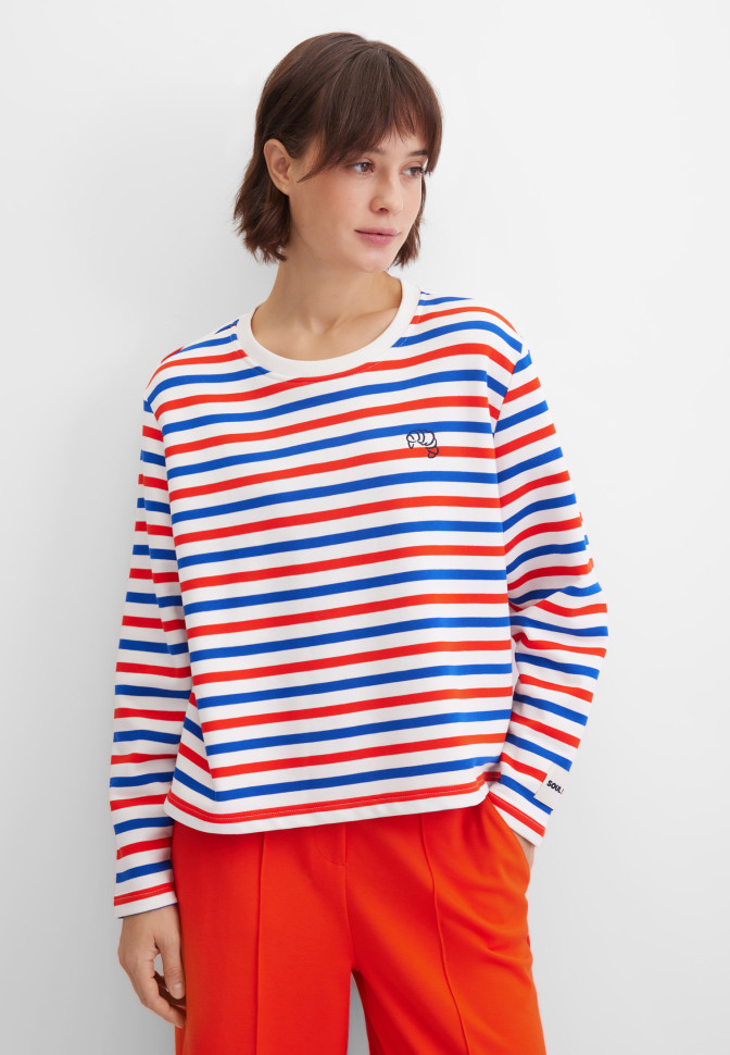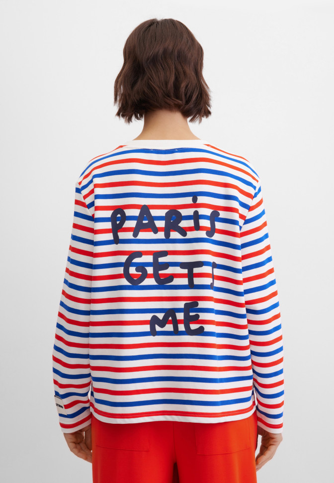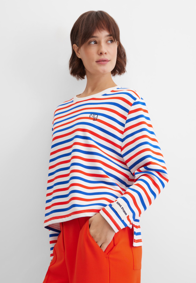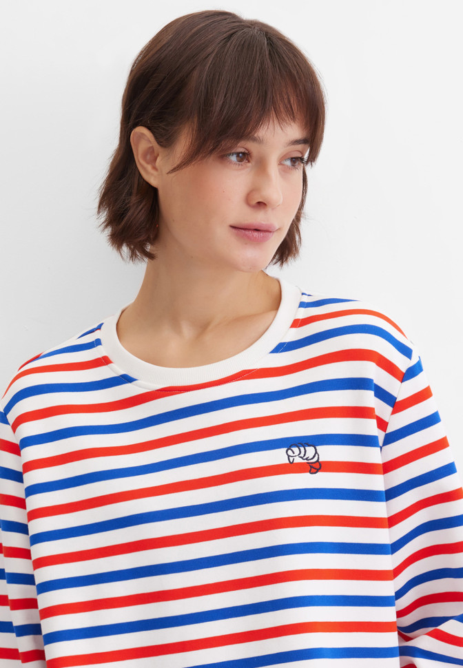 Длина по спинке – 59 см. Свободный свитшот из стопроцентного хлопка в полоску обеспечивает комфорт, воздухопроницаемость и дышащие свойства натурального материала. Прямой крой и спущенный длинный рукав создают расслабленный силуэт, подходящий для повседневных и спортивно-кэжуал образов. Вышивка спереди и нашивка на рукаве делают модель выразительнее, а акцентная надпись сзади добавляет оригинальности. Разрезы по бокам обеспечивают свободу движения и динамику, удлинённая спинка делает посадку более удобной и визуально выравнивает силуэт. Свитшот подходит для прогулок, отдыха, учёбы и многослойных городских комплектов.