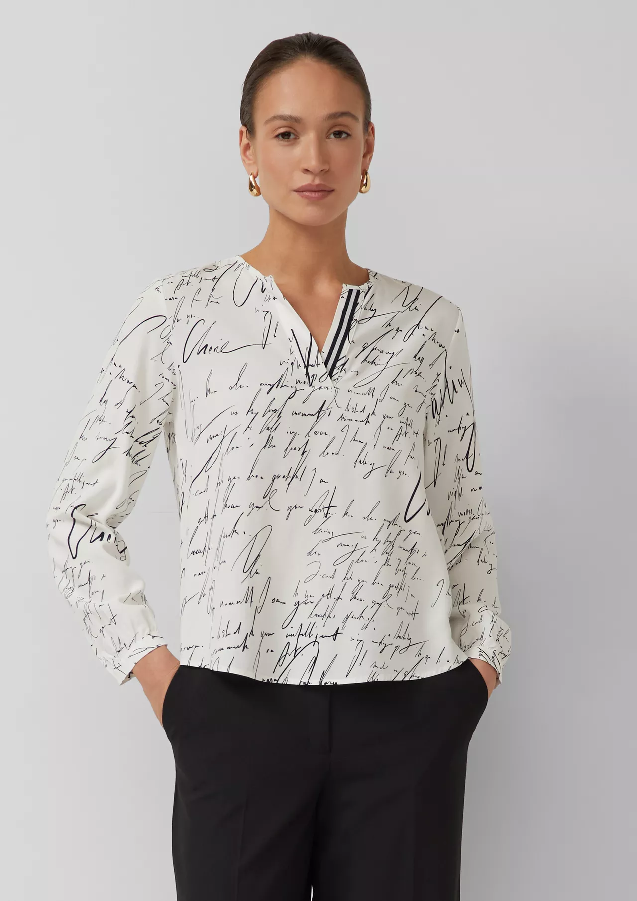 Изысканная элегантность для любого случая: эта вискозная блузка с V-образным вырезом и принтом по всей поверхности сочетает в себе женственную утонченность и современный дизайн. Длинные рукава с застежкой на пуговицы и тонкая отделка лентой подчеркивают высокое качество пошива. Идеально подходящая как для делового, так и для повседневного стиля, она выразит вашу индивидуальность, оставаясь при этом вневременной и универсальной. Незаменимый элемент гардероба для уверенного образа.