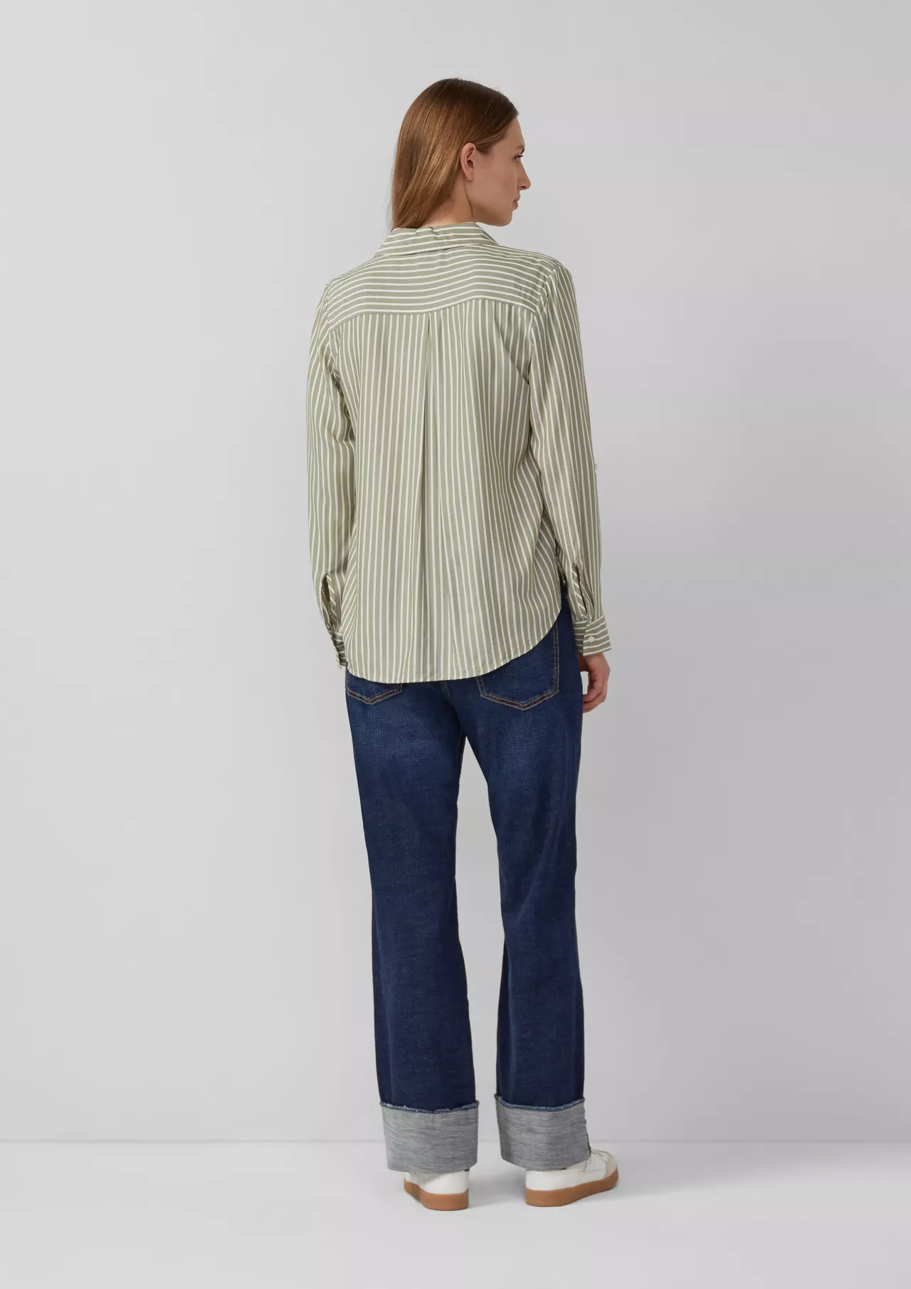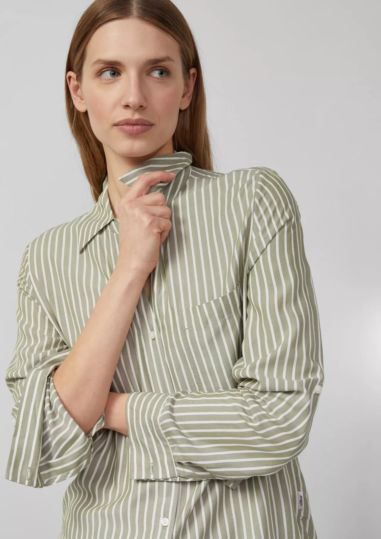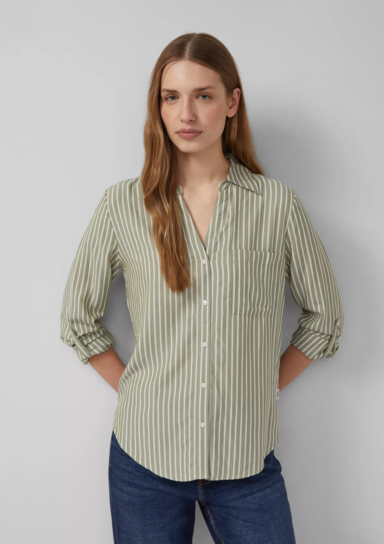 Эта струящаяся вискозная блузка в полоску добавит вашему дню нотку непринужденности! Классический воротник и практичный нагрудный карман делают ее универсальным вариантом – как для офиса, так и для бранча с друзьями. Отвороты на манжетах обеспечат расслабленность и непринужденность, придавая образу женственность.