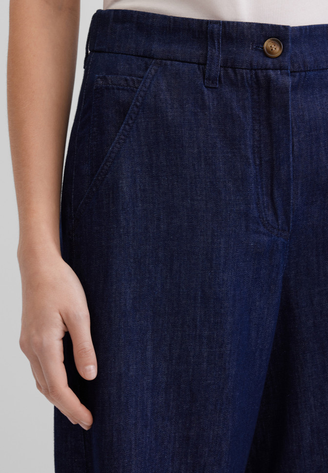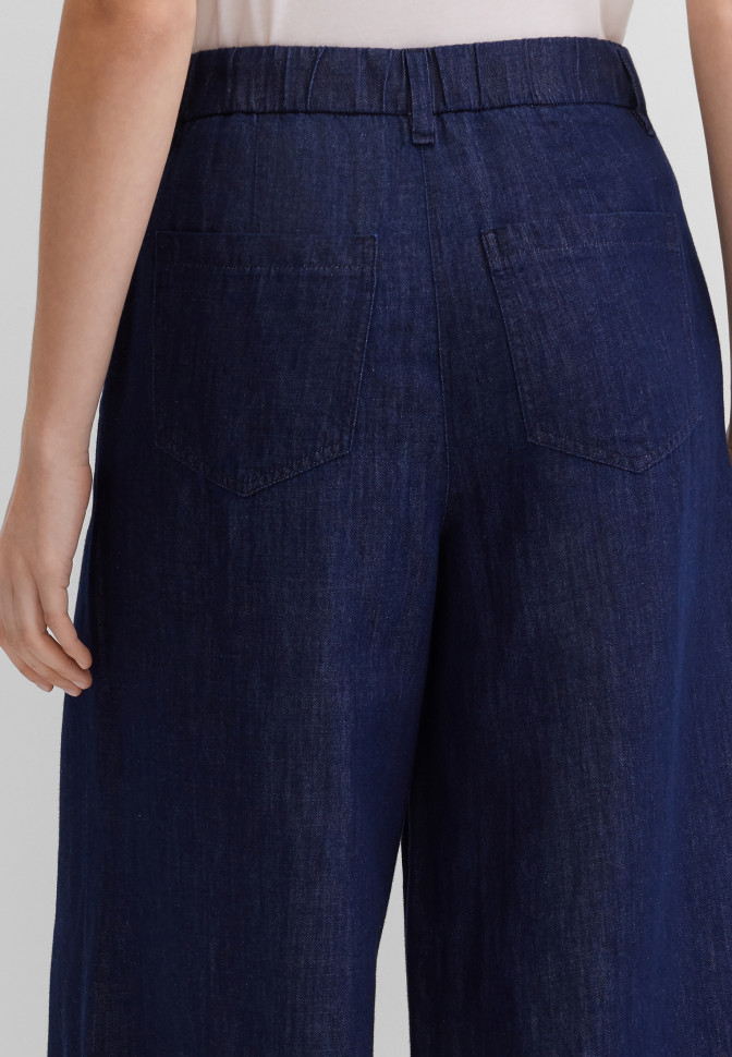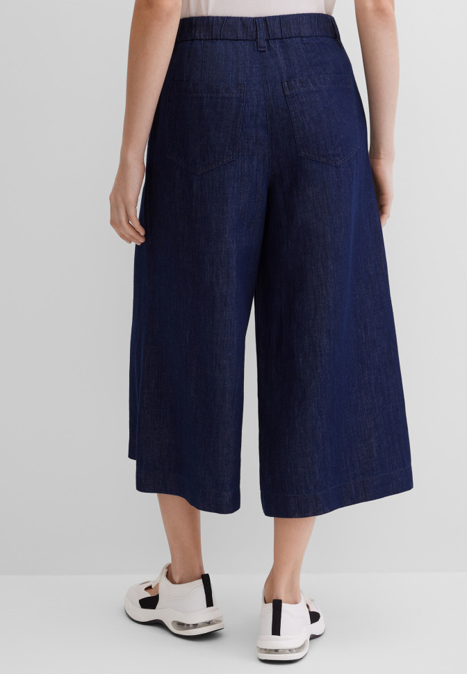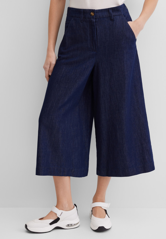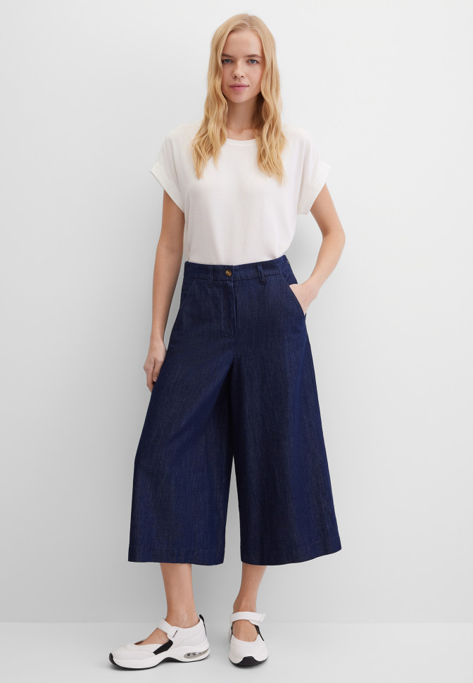 Широкие кюлоты с лёгким клёшем. Выполнены из тонкого, лёгкого, дышащего материала. Застёгиваются на молнию под планкой и классическую пуговицу, сзади на поясе имеется резинка. Передние карманы с отрезным бочком, задние накладные, также имеется монетный кармашек. 5 шлёвок позволяют носить кюлоты с ремнём.