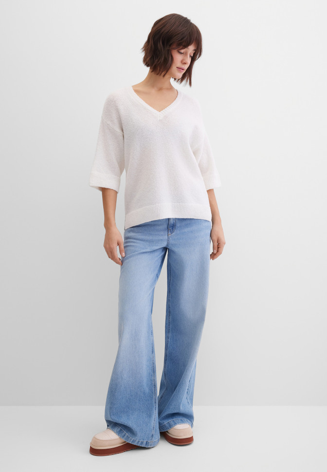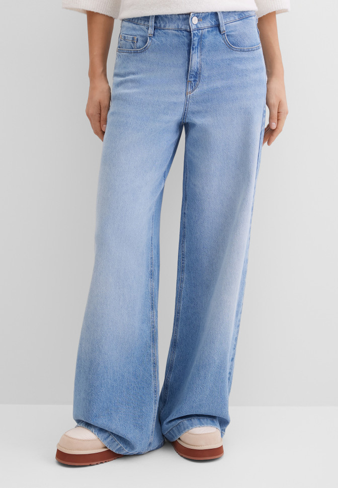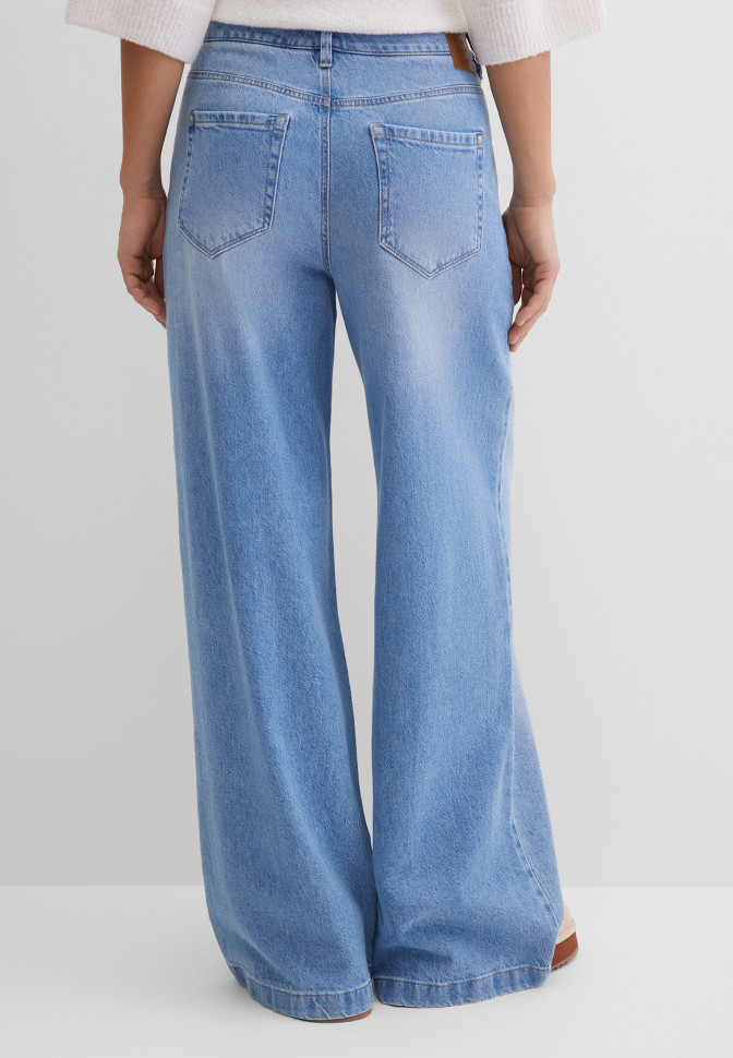 Широкие джинсы клеш со средней посадкой. Выполнены из плотного, слегка тянущегося, нежного денима с лёгким эффектом потёртости. Кокетка обеспечивает посадку модели по фигуре. Застёгиваются джинсы на молнию под планкой и пробивную пуговицу с тиснением в виде логотипа бренда, 5 шлёвок позволяют носить джинсы с ремнём. Передние карманы с отрезным бочком, задние накладные, также имеется монетный кармашек. Швы укреплены заклёпками с тиснением в виде логотипа бренда. Сзади на поясе расположена аппликация с логотипом бренда.