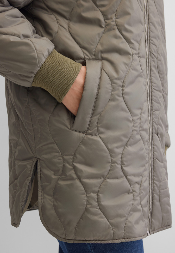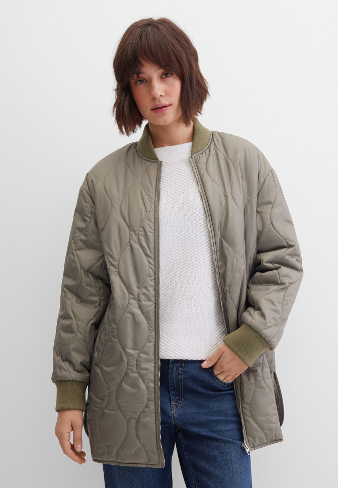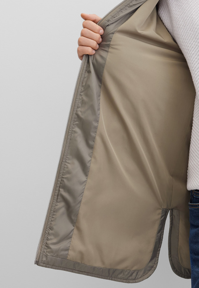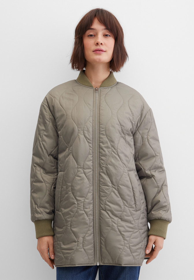 Длина по спинке – 80 см. Тонкая, лёгкая куртка свободного удлинённого кроя с нежной, тактильно приятной подкладкой. Выполнена из гладкого сатинового материала, простёганного вертикальными извилистыми линиями, образующими ненавязчивый цикличный узор. Застёгивается на простую молнию. Снаружи — два прорезных кармана, внутри — один потайной. Рукава оформлены манжетами. Полы декорированы боковыми разрезами. Плотность утеплителя 100 г/кв.м. Подходит для температуры от +5 до +15 °C.