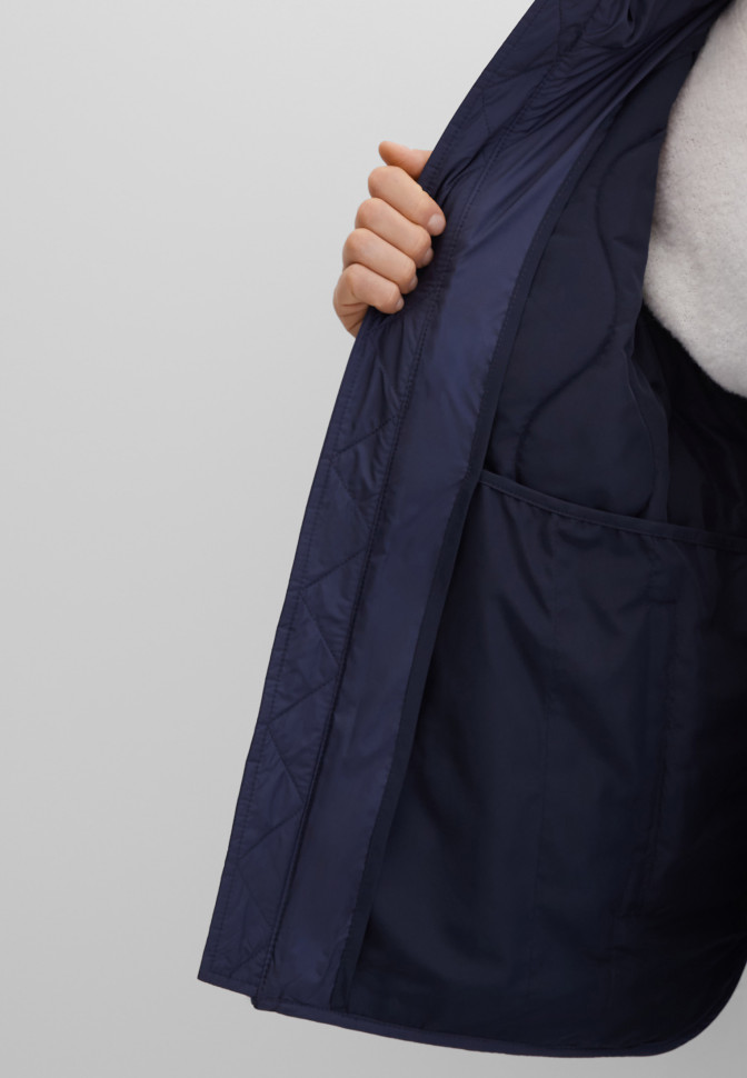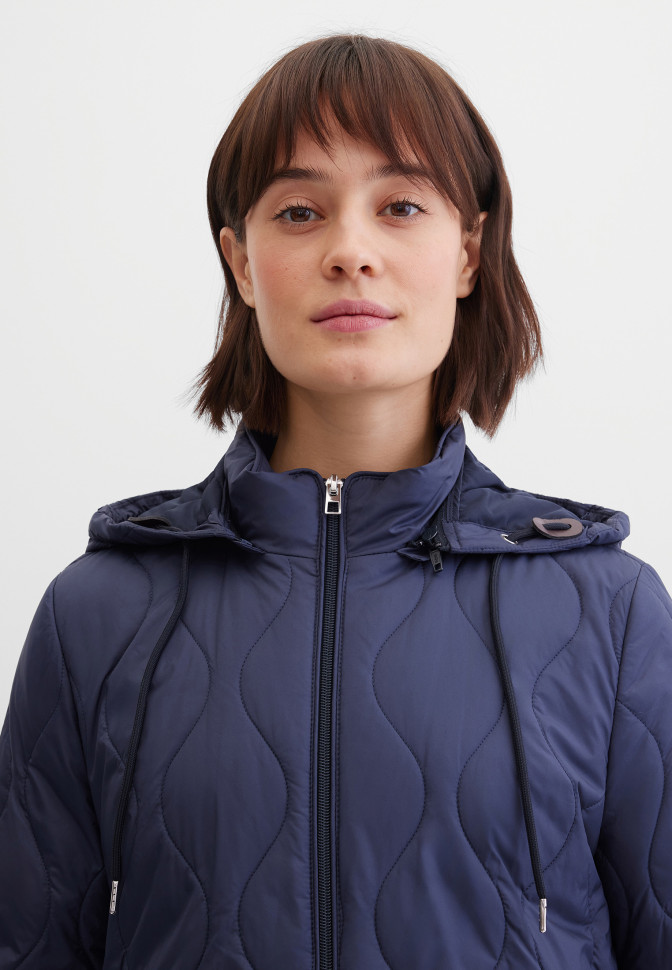 Длина по спинке – 65 см. Куртка прямого кроя, слегка удлинённая сзади. Лёгкая и тонкая модель с полуподкладкой. Выполнена из сатинового гладкого материала, простёганного вертикальными извилистыми линиями, образующими цикличный узор. Застёгивается на молнию с внутренней ветрозащитной планкой. Рукава с узкими манжетами. Снаружи — два прорезных кармана на молниях, внутри — четыре потайных кармана. Ворот выполнен в форме хомута. Капюшон съёмный, крепится на молнии. Утяжка по капюшону реализована через кулиску с круглым шнурком и металлическими эглетами. Полы дополнены боковыми разрезами, закрывающимися на металлические кнопки с тиснением бренда. Плотность утеплителя 100 г/кв.м. Подходит для температуры от +5 до +15 °C.