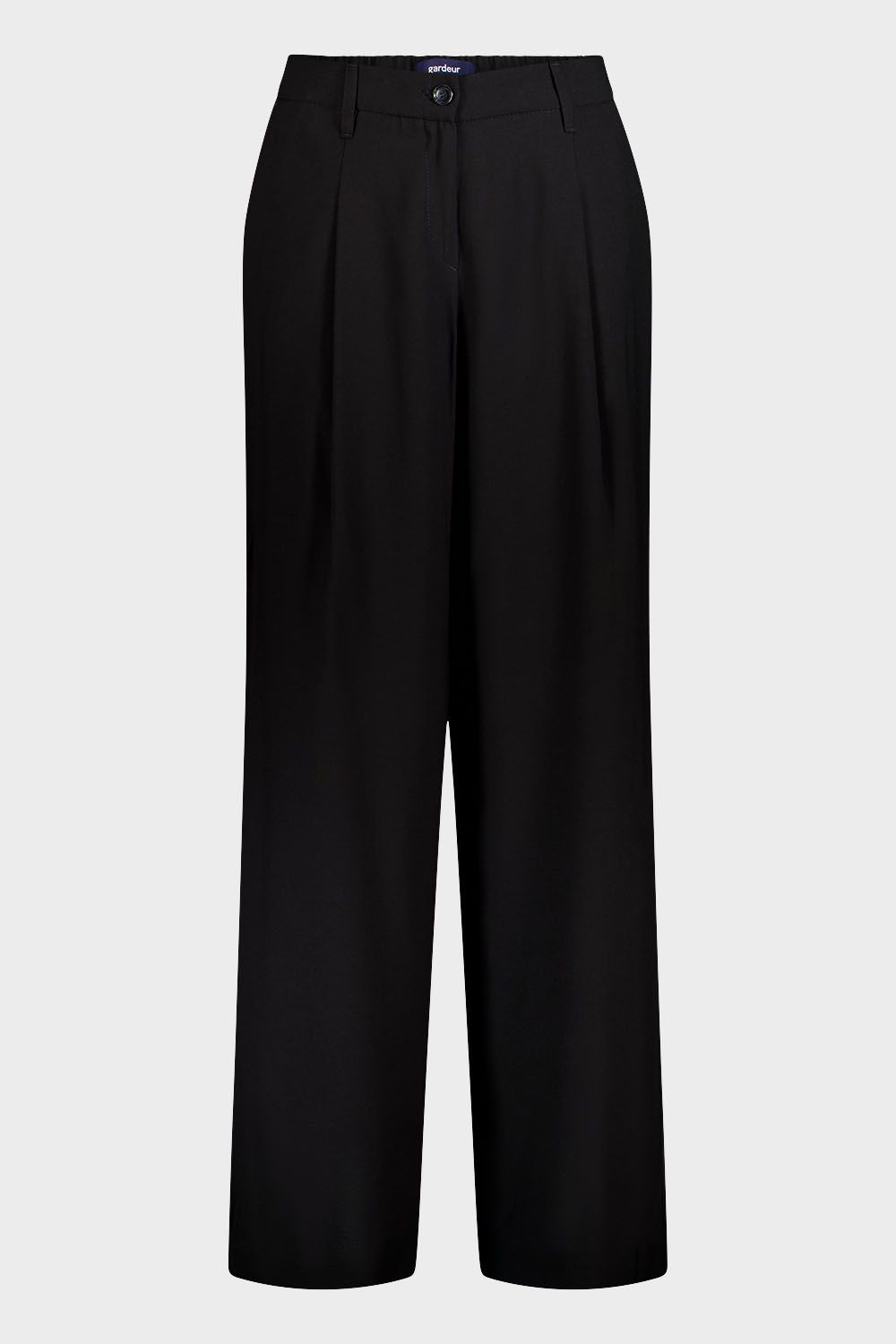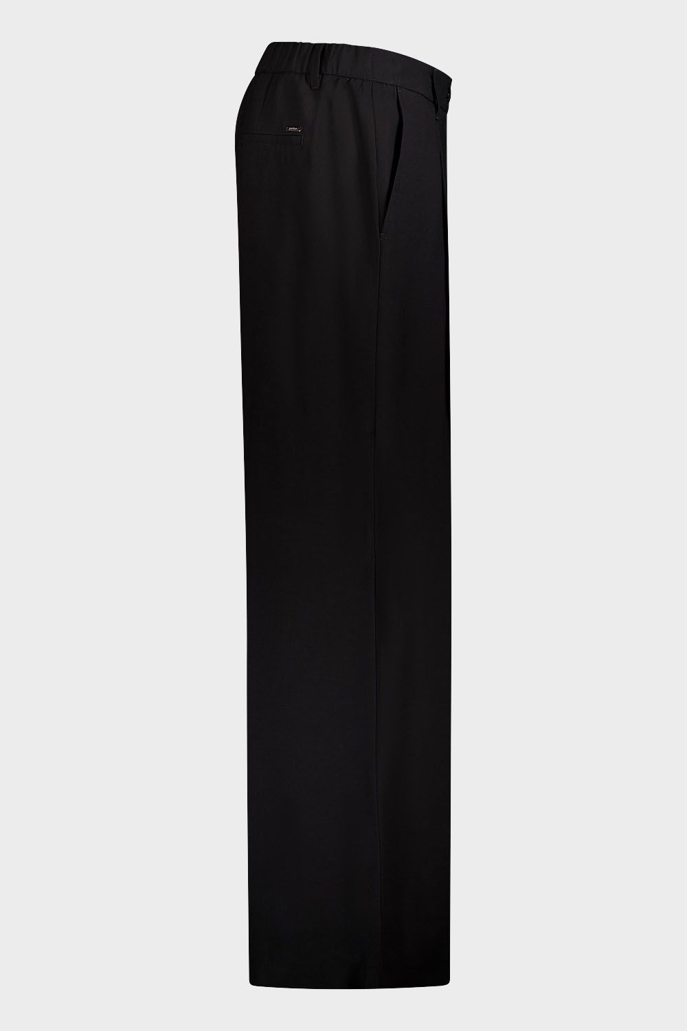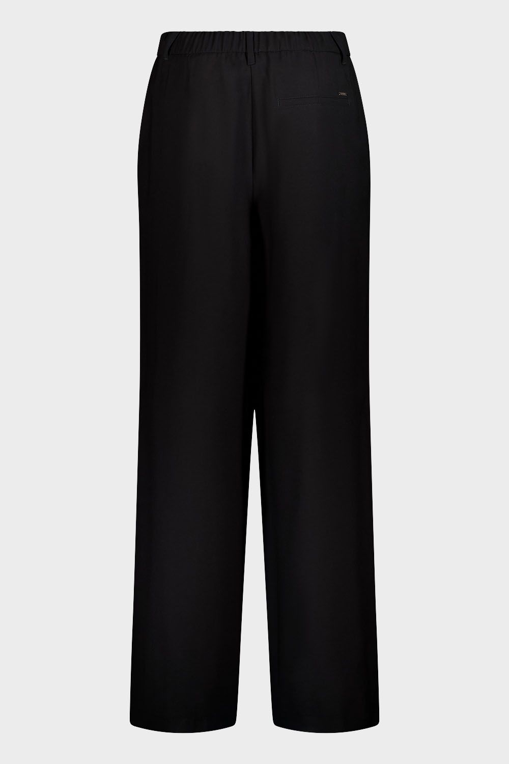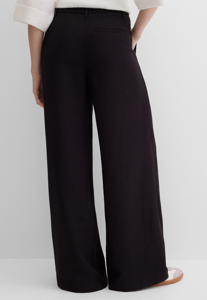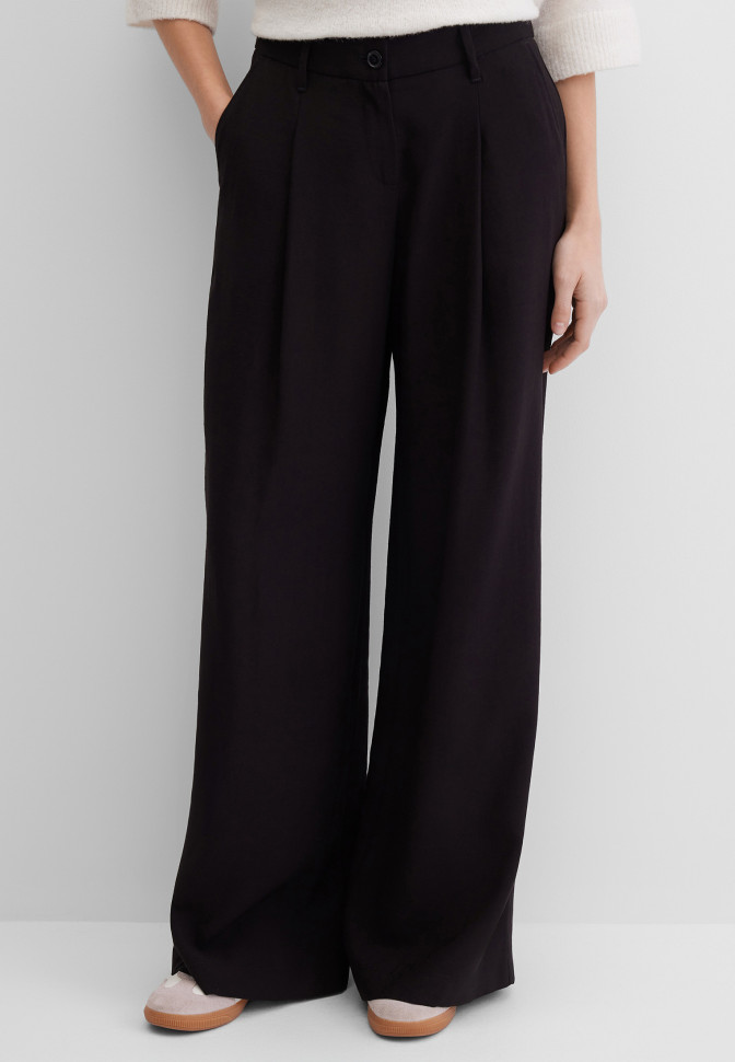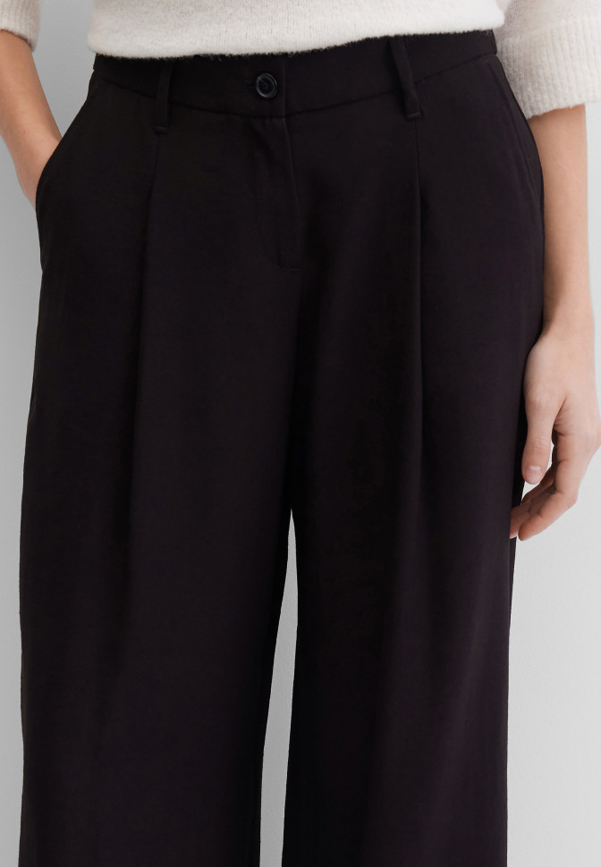Широкие брюки с лёгким клёшем и средней посадкой, модель с защипами. Выполнены из лёгкого, струящегося материала. Застёгиваются на молнию под планкой и классическую пуговицу, сзади на поясе имеется резинка, 5 шлёвок позволяют носить брюки с ремнём. Передние карманы с отрезным бочком, задний – обманка.
