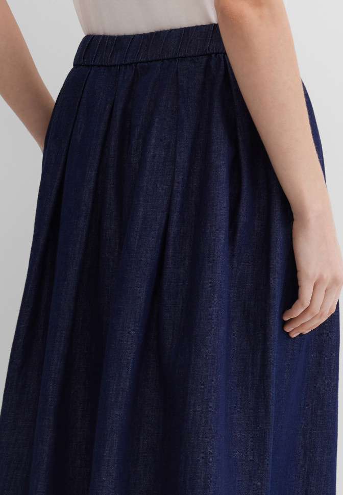 Джинсовая юбка макси со средней посадкой, выполнена из тонкого денима. Модель имеет умеренно выраженный А-силуэт с разрезом сзади, кокетка обеспечивает посадку модели по фигуре. Застёгивается юбка на молнию под планкой и пробивную пуговицу с тиснением в виде логотипа бренда, 5 шлёвок позволяют носить изделие с ремнём. Передние карманы с отрезным бочком, задние накладные, также имеется монетный кармашек. Швы укреплены заклёпками с тиснением в виде логотипа бренда. Сзади на поясе расположена аппликация с логотипом бренда.
