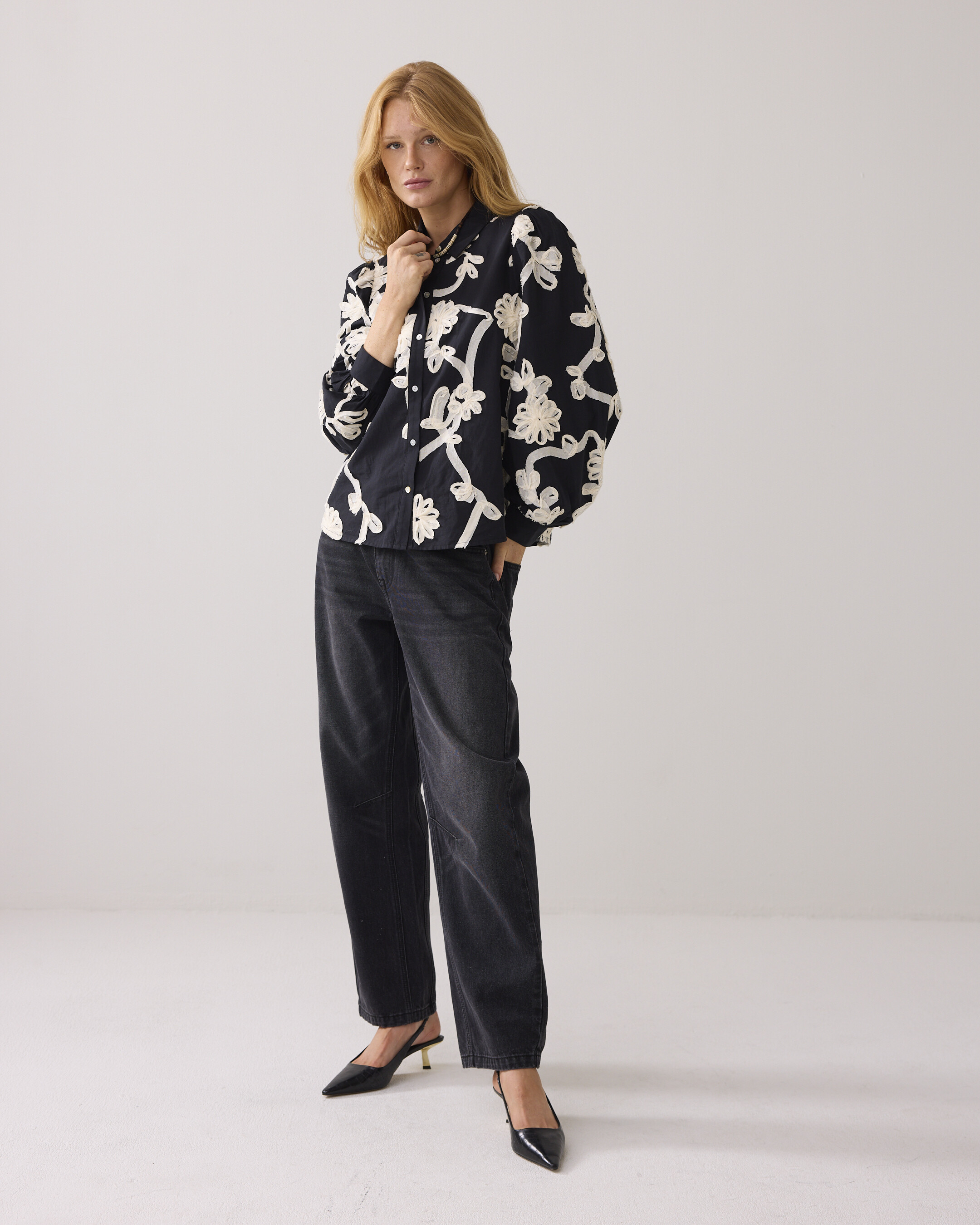 Эта блузка прямого кроя украшена игривой вышивкой из тесьмы с необработанным краем в цветочном узоре. Блузка застёгивается на перламутровые пуговицы-ракушки и имеет рукава-буфы.